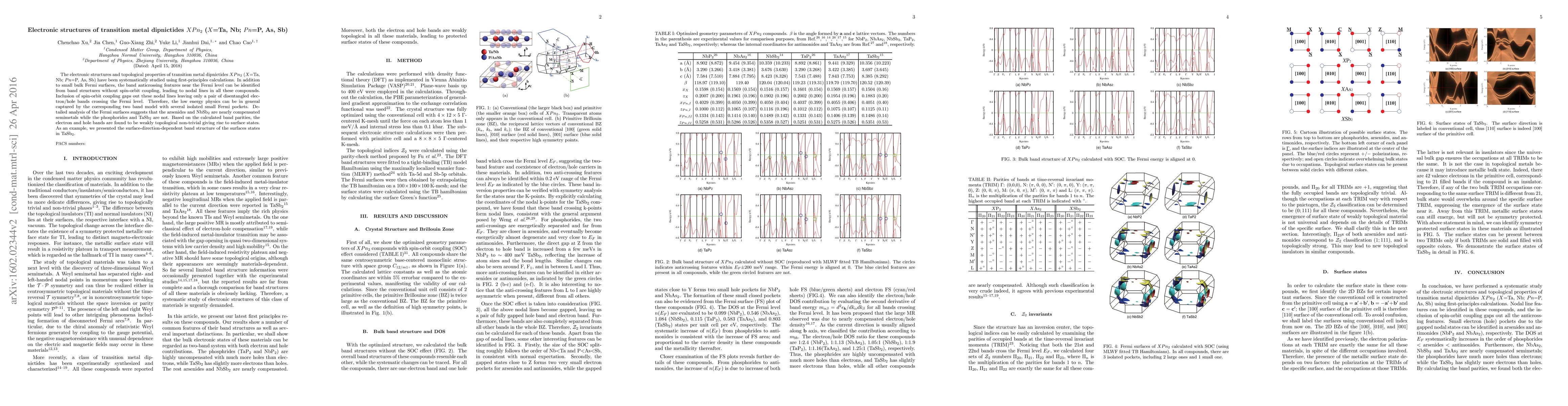 This study investigates the electronic structures and topological properties of transition metal dipnictides using first-principles calculations, revealing nodal lines in band structures without spin-orbit coupling. Inclusion of spin-orbit coupling gaps these nodal lines, resulting in a two-band model with small Fermi pockets, and indicates weakly topological non-trivial electron and hole bands with surface states, exemplified in TaSb$_2$.