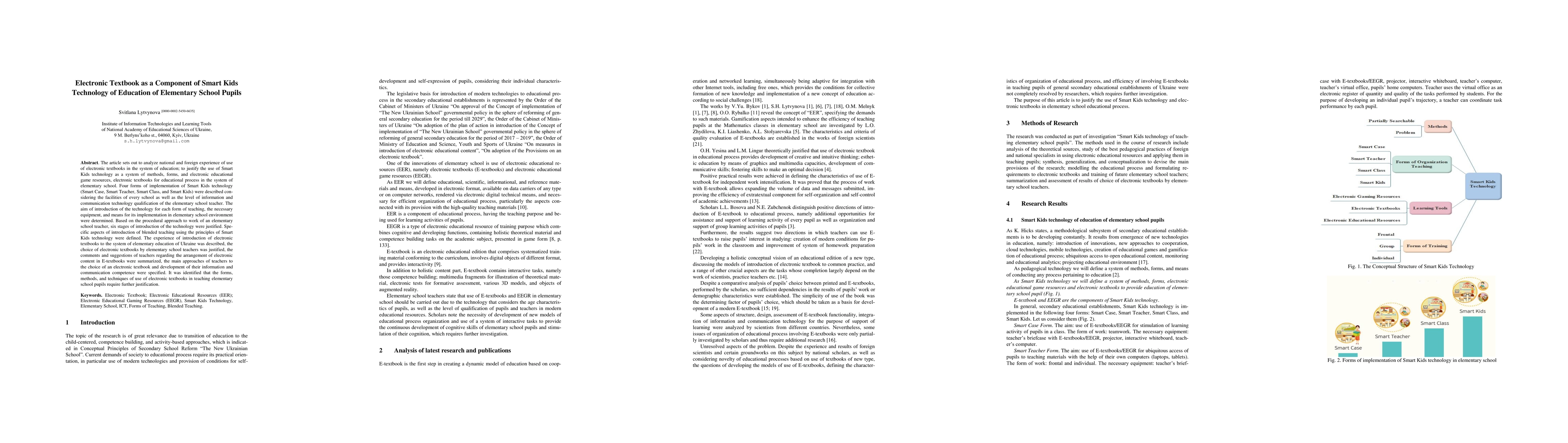 The article sets out to analyze national and foreign experience of use of electronic textbooks in the system of education; to justify the use of Smart Kids technology as a system of methods, forms, and electronic educational game resources, electronic textbooks for educational process in the system of elementary school. Four forms of implementation of Smart Kids technology (Smart Case, Smart Teacher, Smart Class, and Smart Kids) were described con-sidering the facilities of every school as well as the level of information and communication technology qualification of the elementary school teacher. The aim of introduction of the technology for each form of teaching, the necessary equipment, and means for its implementation in elementary school environment were determined. Based on the procedural approach to work of an elementary school teacher, six stages of introduction of the technology were justified. Spe-cific aspects of introduction of blended teaching using the principles of Smart Kids technology were defined. The experience of introduction of electronic textbooks to the system of elementary education of Ukraine was described, the choice of electronic textbooks by elementary school teachers was justified, the comments and suggestions of teachers regarding the arrangement of electronic content in E-textbooks were summarized, the main approaches of teachers to the choice of an electronic textbook and development of their information and communication competence were specified. It was identified that the forms, methods, and techniques of use of electronic textbooks in teaching elementary school pupils require further justification.