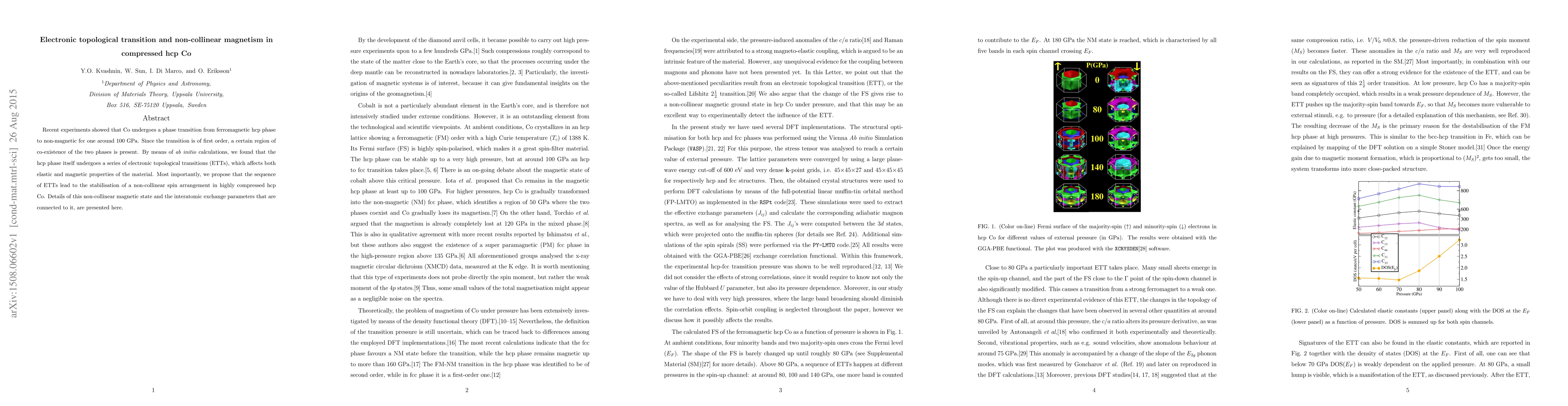 Recent experiments showed that Co undergoes a phase transition from ferromagnetic hcp phase to non-magnetic fcc one around 100 GPa. Since the transition is of first order, a certain region of co-existence of the two phases is present. By means of \textit{ab initio} calculations, we found that the hcp phase itself undergoes a series of electronic topological transitions (ETTs), which affects both elastic and magnetic properties of the material. Most importantly, we propose that the sequence of ETTs lead to the stabilisation of a non-collinear spin arrangement in highly compressed hcp Co. Details of this non-collinear magnetic state and the interatomic exchange parameters that are connected to it, are presented here.