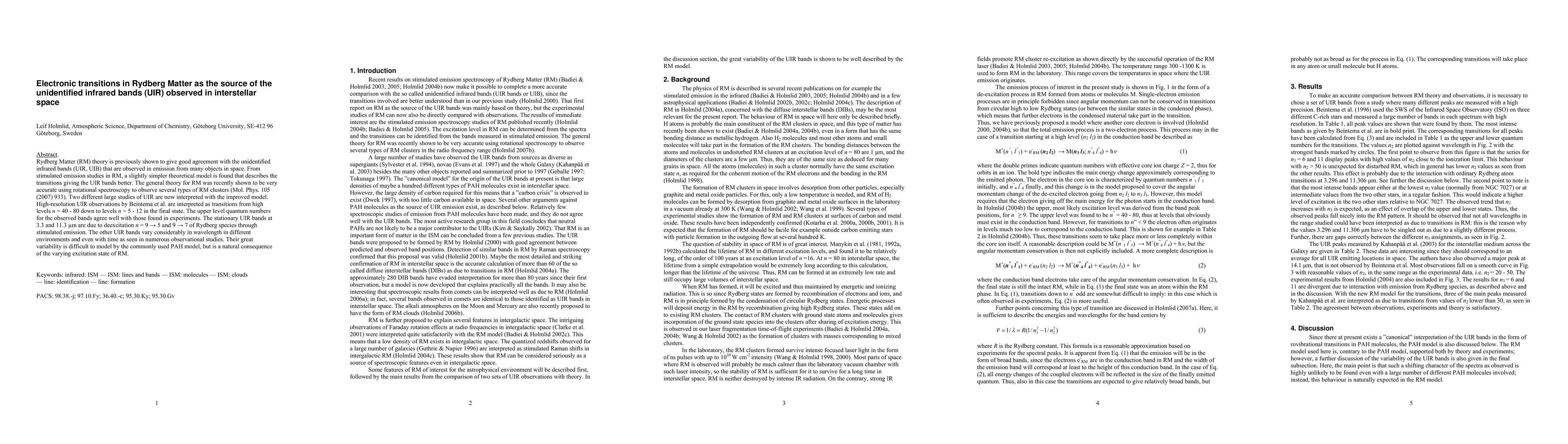 Rydberg Matter (RM) theory is previously shown to give good agreement with the unidentified infrared bands (UIR, UIB) that are observed in emission from many objects in space. From stimulated emission studies in RM, a slightly simpler theoretical model is found that describes the transitions giving the UIR bands better. The general theory for RM was recently shown to be very accurate using rotational spectroscopy to observe several types of RM clusters (Mol. Phys. 105 (2007) 933). Two different large studies of UIR are now interpreted with the improved model. High-resolution UIR observations by Beintema et al. are interpreted as transitions from high levels n = 40 - 80 down to levels n = 5 - 12 in the final state. The upper level quantum numbers for the observed bands agree well with those found in experiments. The stationary UIR bands at 3.3 and 11.3 micrometer are due to deexcitation n = 9 -> 5 and 9 -> 7 of Rydberg species through stimulated emission. The other UIR bands vary considerably in wavelength in different environments and even with time as seen in numerous observational studies. Their great variability is difficult to model by the commonly used PAH model, but is a natural consequence of the varying excitation state of RM.