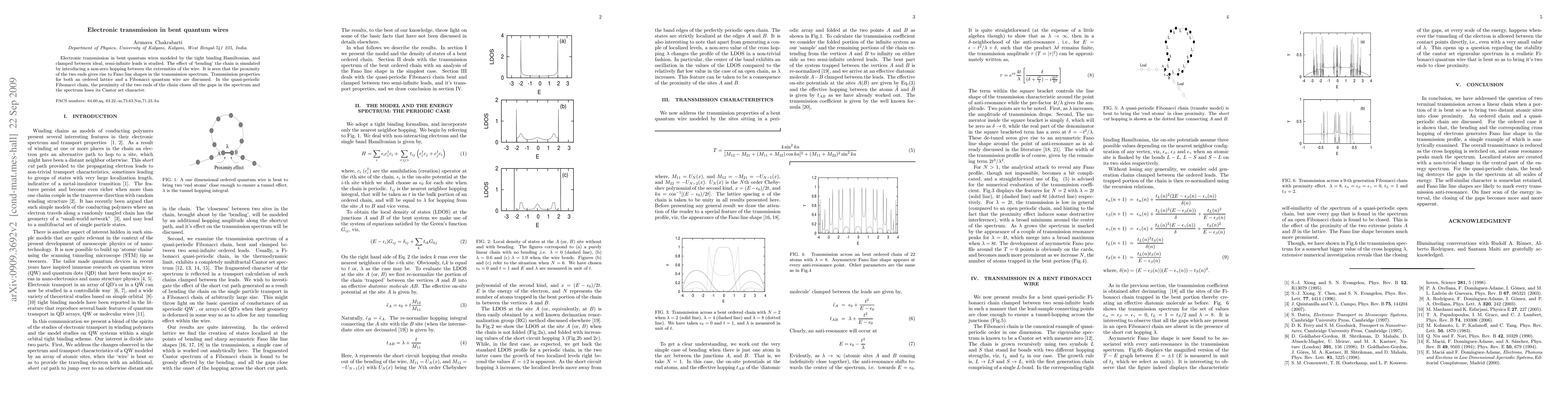 Electronic transmission in bent quantum wires modeled by the tight binding Hamiltonian, and clamped between ideal, semi-infinite leads is studied. The effect of `bending' the chain is simulated by introducing a non-zero hopping between the extremities of the wire. It is seen that the proximity of the two ends gives rise to Falo line shapes in the transmission spectrum. Transmission properties for both an ordered lattice and a Fibonacci quantum wire are discussed. In the quasi-periodic Fibonacci chain, the proximity of the two ends of the chain closes all the gaps in the spectrum and the spectrum loses it's Cantor set character.