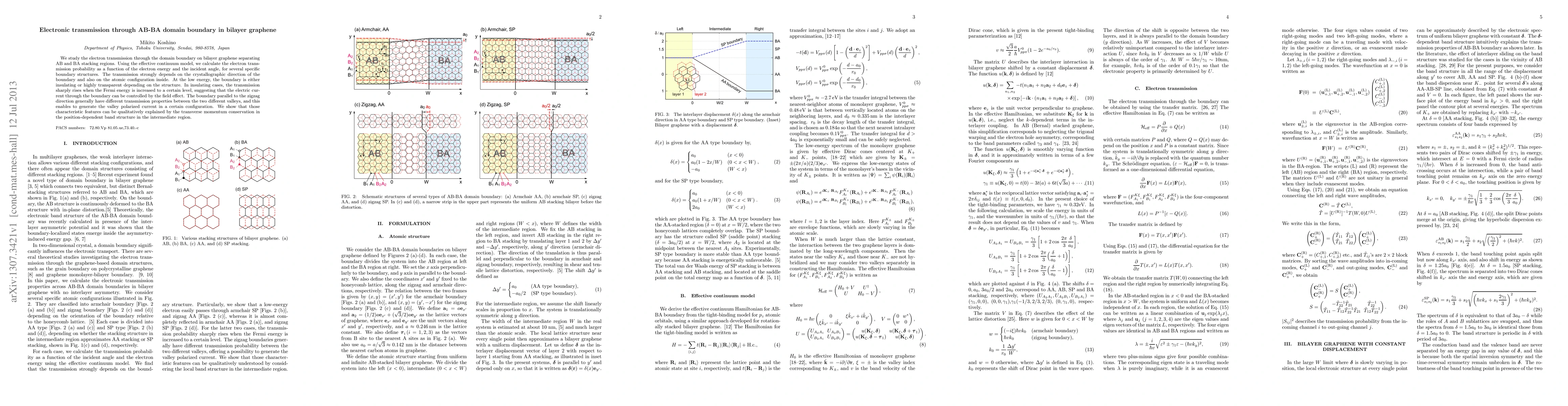 We study the electron transmission through the domain boundary on bilayer graphene separating AB and BA stacking regions. Using the effective continuum model, we calculate the electron transmission probability as a function of the electron energy and the incident angle, for several specific boundary structures. The transmission strongly depends on the crystallographic direction of the boundary and also on the atomic configuration inside. At the low energy, the boundary is either insulating or highly transparent depending on the structure. In insulating cases, the transmission sharply rises when the Fermi energy is increased to a certain level, suggesting that the electric current through the boundary can be controlled by the field effect. The boundary parallel to the zigzag direction generally have different transmission properties between the two different valleys, and this enables to generate the valley polarized current in a certain configuration. We show that those characteristic features can be qualitatively explained by the transverse momentum conservation in the position-dependent band structure in the intermediate region.