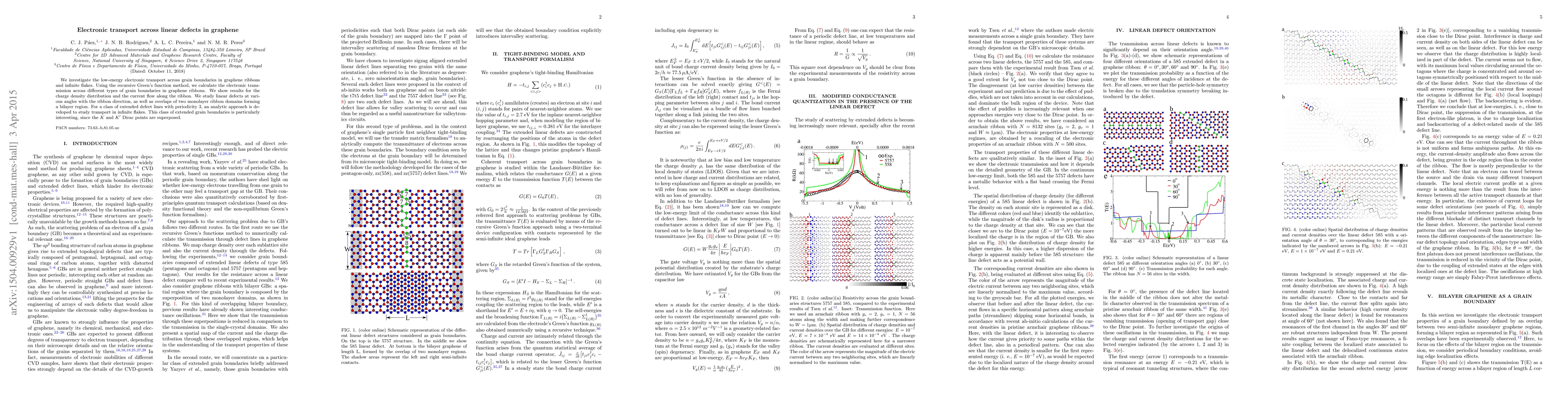This research examines low-energy electronic transport across grain boundaries in graphene, employing recursive Green's function methods to analyze transmission and current flow. It highlights the impact of linear defects and their orientation on electronic behavior, particularly focusing on extended defect lines where $K$ and $K'$ Dirac points overlap.