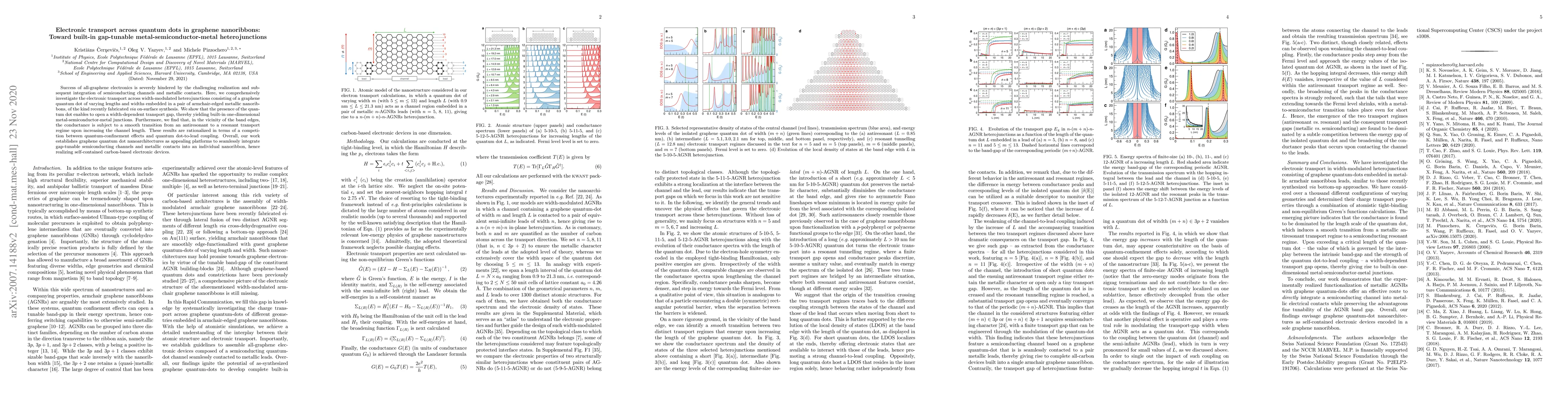 This study investigates electronic transport across quantum dots in graphene nanoribbons, revealing a width-dependent transport gap opening that forms tunable metal-semiconductor-metal junctions. The research demonstrates a smooth conductance transition from antiresonant to resonant regimes, paving the way for integrated, gap-tunable semiconducting channels and metallic contacts in graphene-based devices.