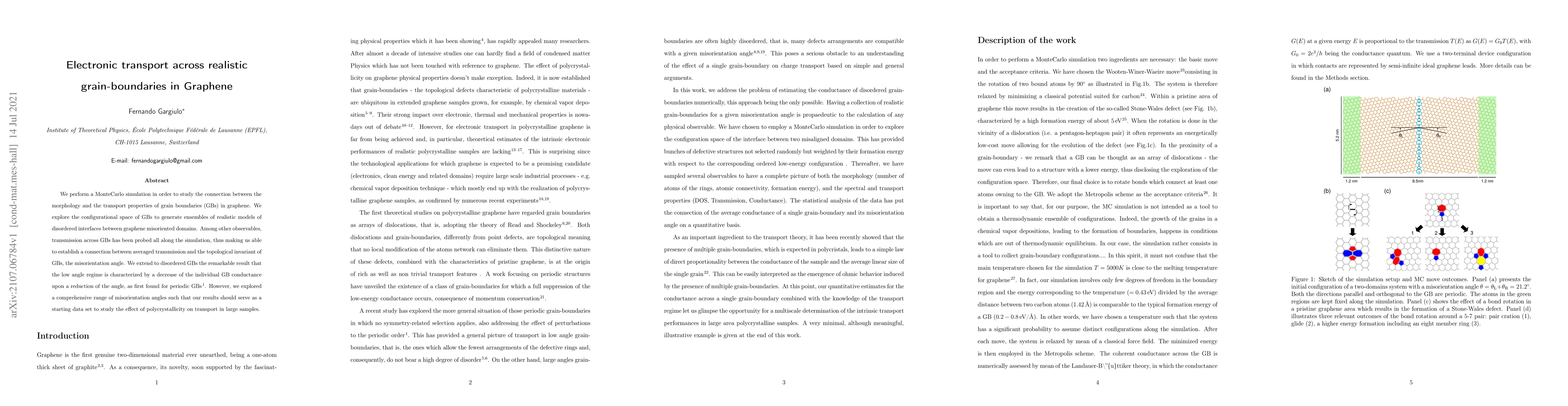 The paper uses MonteCarlo simulations to investigate the impact of grain boundary morphology on electronic transport in graphene, finding that lower misorientation angles lead to reduced conductance in disordered interfaces, extending known periodic GB behaviors to realistic, polycrystalline models. The results provide foundational data for understanding polycrystalline effects on transport in large graphene samples.