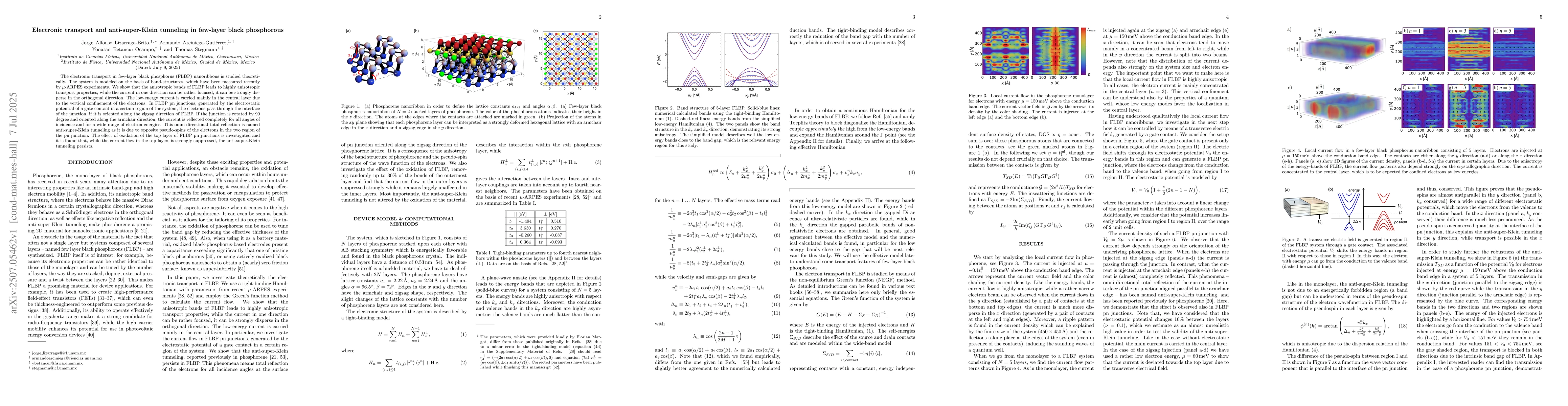 This work extends previous studies on phosphorene by focusing on few-layer black phosphorus, demonstrating anisotropic transport and the robustness of anti-super-Klein tunneling against oxidation, which has implications for potential device applications.
