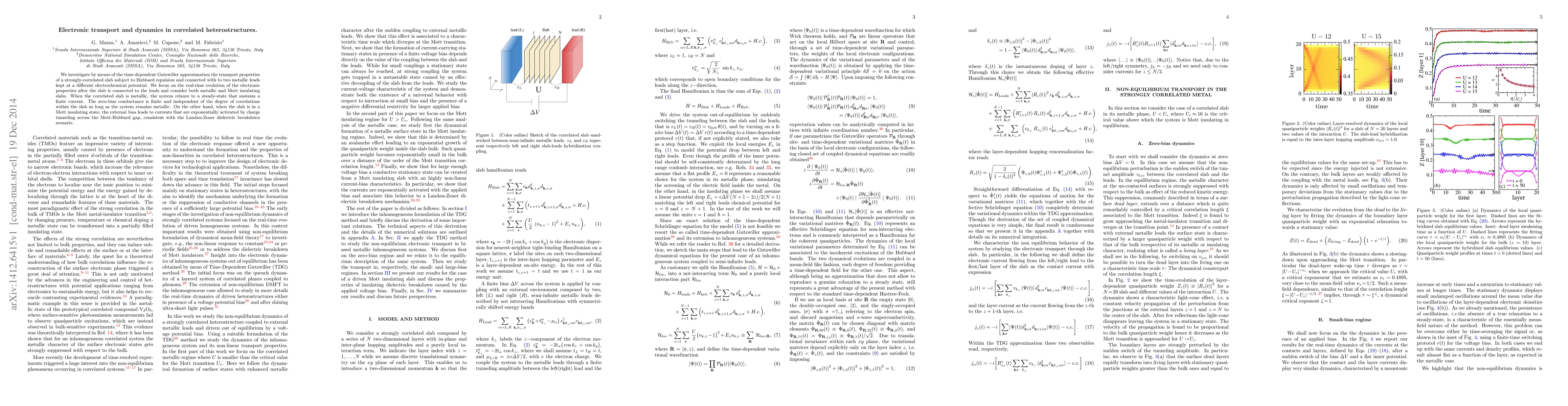 We investigate by means of the time-dependent Gutzwiller approximation the transport properties of a strongly-correlated slab subject to Hubbard repulsion and connected with to two metallic leads kept at a different electrochemical potential. We focus on the real-time evolution of the electronic properties after the slab is connected to the leads and consider both metallic and Mott insulating slabs. When the correlated slab is metallic, the system relaxes to a steady-state that sustains a finite current. The zero-bias conductance is finite and independent of the degree of correlations within the slab as long as the system remains metallic. On the other hand, when the slab is in a Mott insulating state, the external bias leads to currents that are exponentially activated by charge tunneling across the Mott-Hubbard gap, consistent with the Landau-Zener dielectric breakdown scenario.