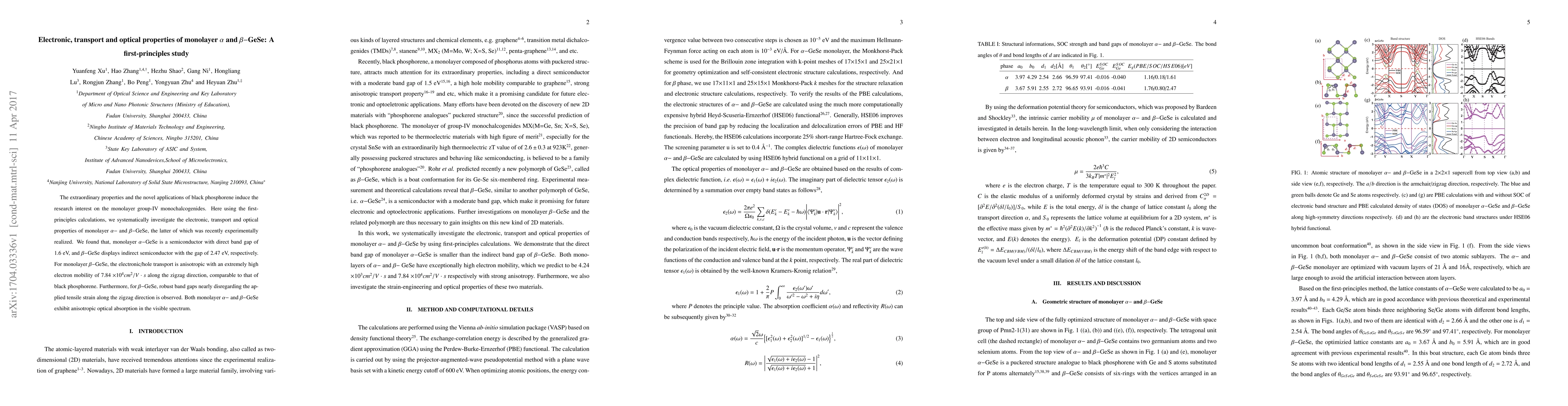 First-principles study reveals monolayer $\alpha-$GeSe as a direct band gap semiconductor with 1.6 eV, while monolayer $\beta-$GeSe is an indirect semiconductor with a 2.47 eV gap, showing high electron mobility and robust optical absorption in the visible spectrum.