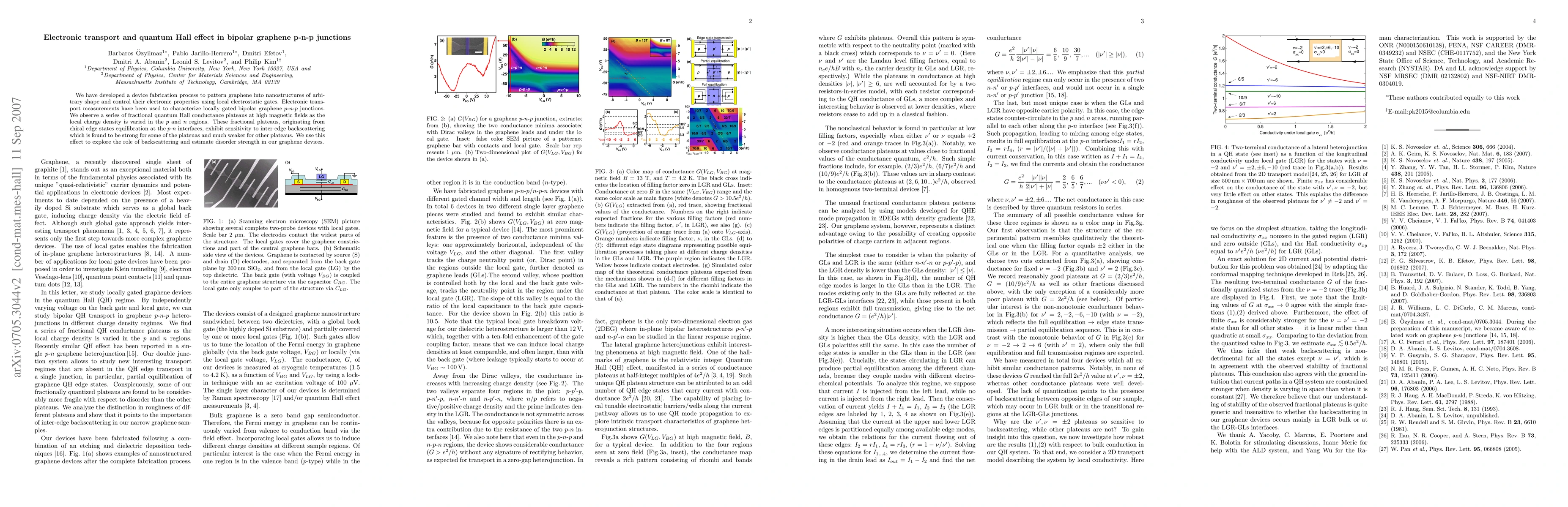 We have developed a device fabrication process to pattern graphene into nanostructures of arbitrary shape and control their electronic properties using local electrostatic gates. Electronic transport measurements have been used to characterize locally gated bipolar graphene $p$-$n$-$p$ junctions. We observe a series of fractional quantum Hall conductance plateaus at high magnetic fields as the local charge density is varied in the $p$ and $n$ regions. These fractional plateaus, originating from chiral edge states equilibration at the $p$-$n$ interfaces, exhibit sensitivity to inter-edge backscattering which is found to be strong for some of the plateuas and much weaker for other plateaus. We use this effect to explore the role of backscattering and estimate disorder strength in our graphene devices.