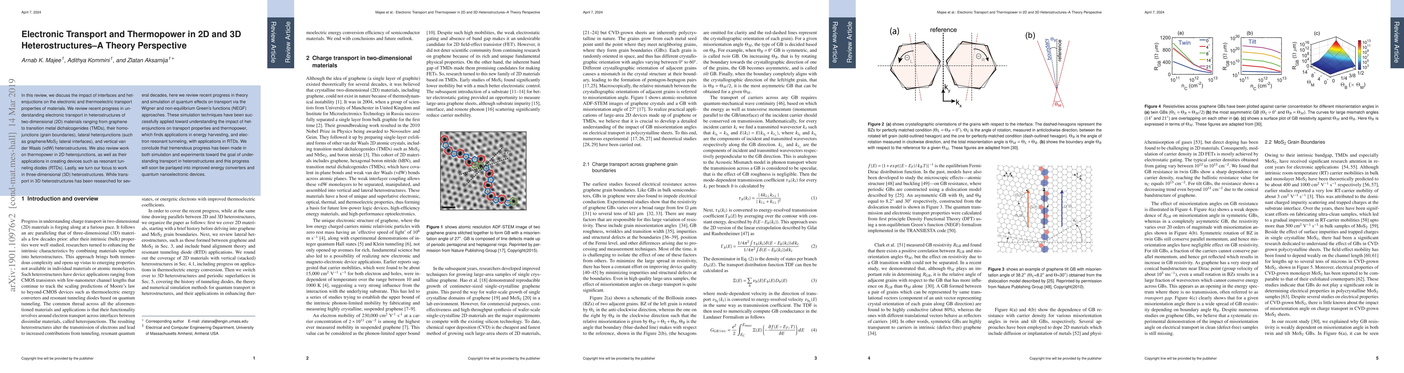 In this review, we discuss the impact of interfaces and heterojuctions on the electronic and thermoelectric transport properties of materials. We review recent progress in understanding electronic transport in two-dimensional (2D) materials ranging from graphene to transition metal dichalcogenides (TMDs), their homojunctions (grain boundaries), lateral heterojunctions (such as graphene/MoS$_2$ lateral interfaces), and vertical van der Waals (vdW) heterostructures. We also review work in thermoelectric properties of 2D heterojunctions, as well as their applications in creating devices such as resonant tunneling diodes (RTDs). Lastly, we turn our focus to work in three-dimensional (3D) heterostructures. While transport in 3D heterostructures has been researched for several decades, here we review recent progress in theory and simulation of quantum effects on transport via the Wigner and non-equilibrium Green's functions (NEGF) approaches. These simulation techniques have been successfully applied toward understanding the impact of heterojunctions on the thermoelectric properties, with applications in energy harvesting, and electron resonant tunneling, with applications in RTDs. We conclude that tremendous progress has been made in both simulation and experiments toward the goal of understanding transport in heterostructures and this progress will soon be parlayed into improved energy converters and quantum nanoelectronic devices.