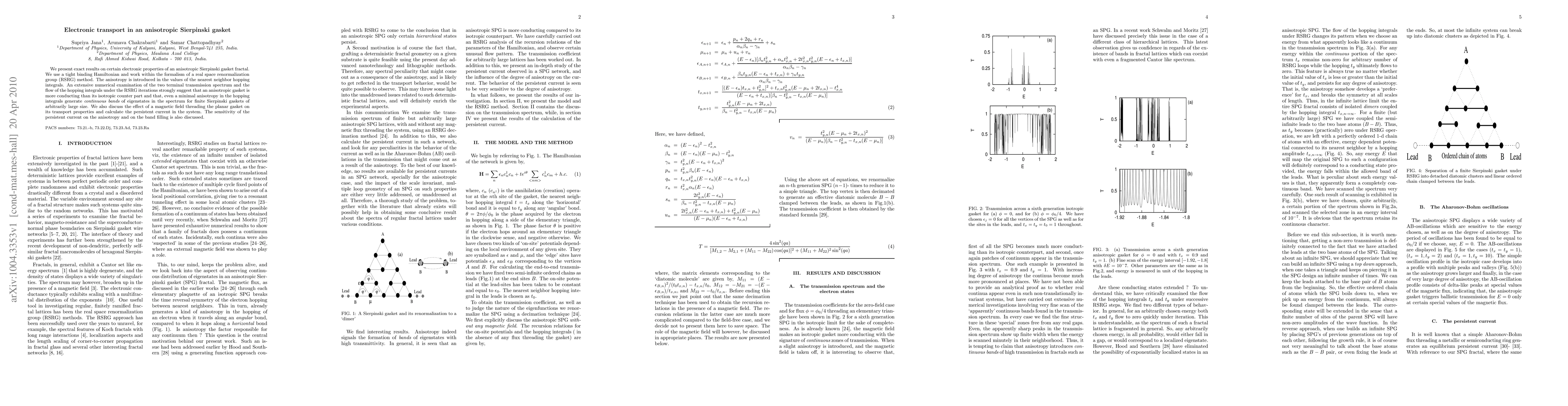 This paper investigates electronic transport in an anisotropic Sierpinski gasket using a tight binding Hamiltonian and real space renormalization group method. The study finds that anisotropy enhances conductivity and generates continuous bands of eigenstates, while a magnetic field influences the persistent current, which is sensitive to both anisotropy and band filling.