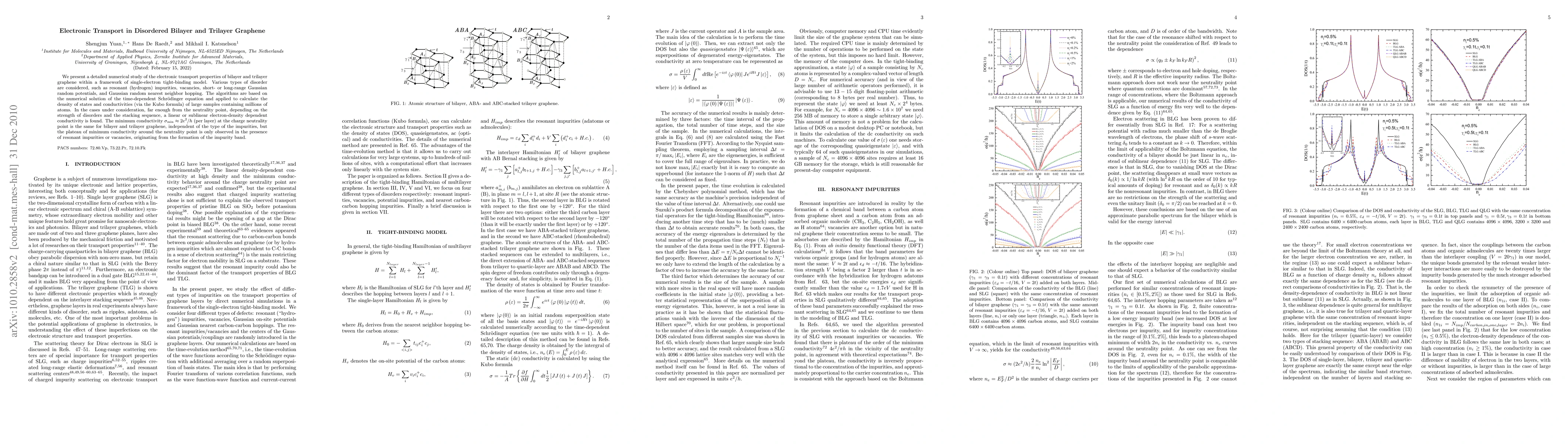 This paper conducts a numerical study on electronic transport in disordered bilayer and trilayer graphene using a tight-binding model, revealing a linear or sublinear conductivity dependent on disorder strength and stacking sequence. The minimum conductivity near neutrality is consistently $2e^{2}/h$ per layer, with a plateau observed only with resonant impurities or vacancies forming an impurity band.