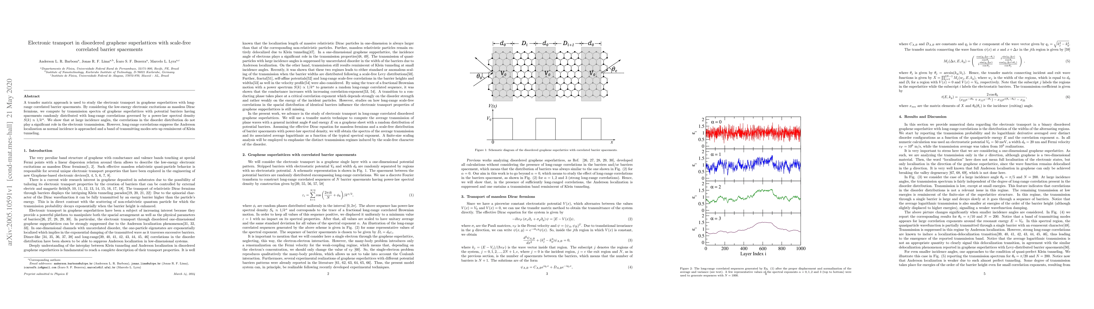 This paper uses a transfer matrix approach to investigate electronic transport in disordered graphene superlattices with long-range correlated barrier spacings. It finds that while large incidence angles show minimal impact from disorder correlations, long-range correlations suppress Anderson localization and induce a band of transmitting modes near normal incidence, akin to Klein tunneling.