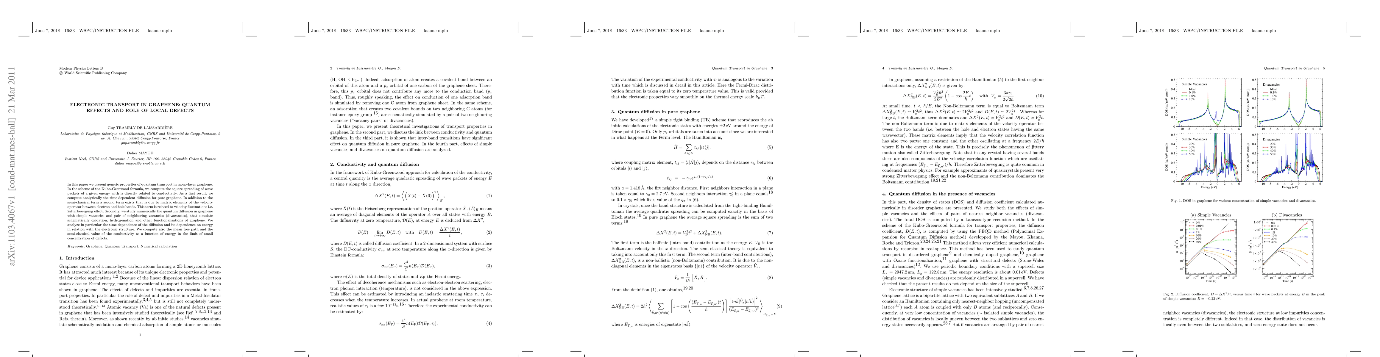 In this paper we present generic properties of quantum transport in mono-layer graphene. In the scheme of the Kubo-Geenwood formula, we compute the square spreading of wave packets of a given energy with is directly related to conductivity. As a first result, we compute analytically the time dependent diffusion for pure graphene. In addition to the semi-classical term a second term exists that is due to matrix elements of the velocity operator between electron and hole bands. This term is related to velocity fluctuations i.e. Zitterbewegung effect. Secondly, we study numerically the quantum diffusion in graphene with simple vacancies and pair of neighboring vacancies (divacancies), that simulate schematically oxidation, hydrogenation and other functionalisations of graphene. We analyze in particular the time dependence of the diffusion and its dependence on energy in relation with the electronic structure. We compute also the mean free path and the semi-classical value of the conductivity as a function of energy in the limit of small concentration of defects.