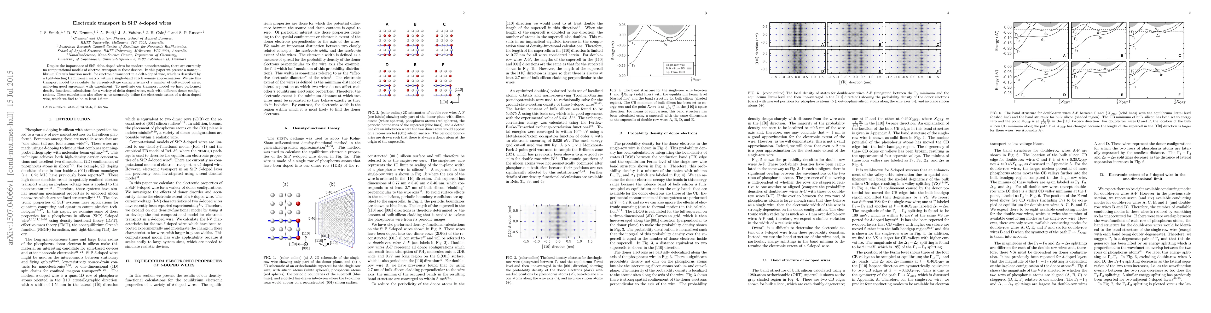 This paper develops a nonequilibrium Green's function model for electronic transport in Si:P delta-doped wires, achieving good agreement with experimental current-voltage characteristics. Density-functional calculations define the electronic extent of these wires as at least 4.6 nm.