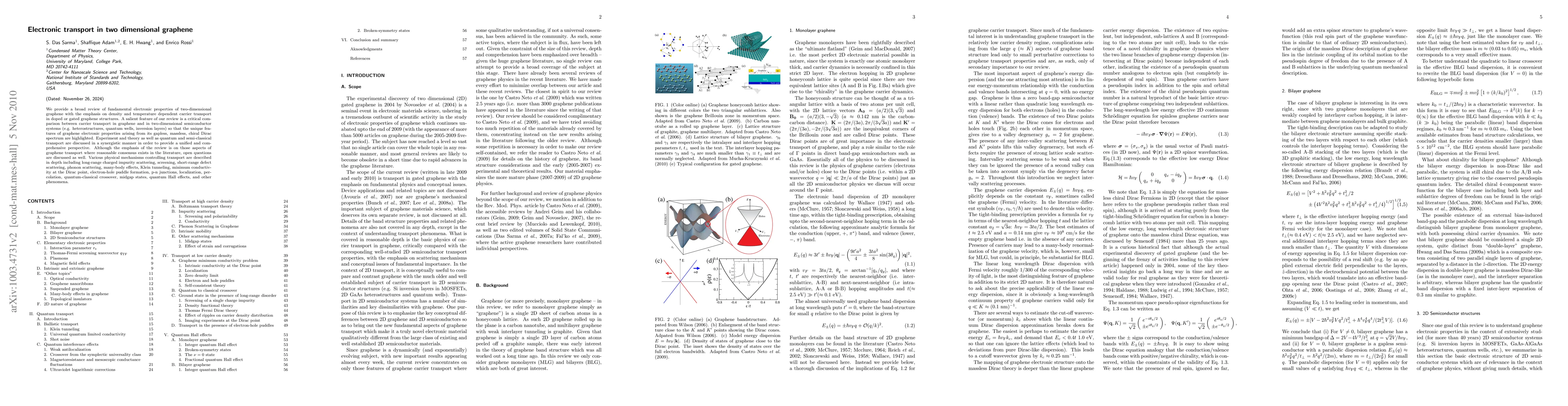 This paper reviews the fundamental electronic transport properties of graphene, focusing on carrier transport influenced by density and temperature in doped or gated structures. It compares graphene's unique electronic characteristics, arising from its massless, chiral Dirac spectrum, with those of two-dimensional semiconductor systems, discussing various physical mechanisms affecting transport.