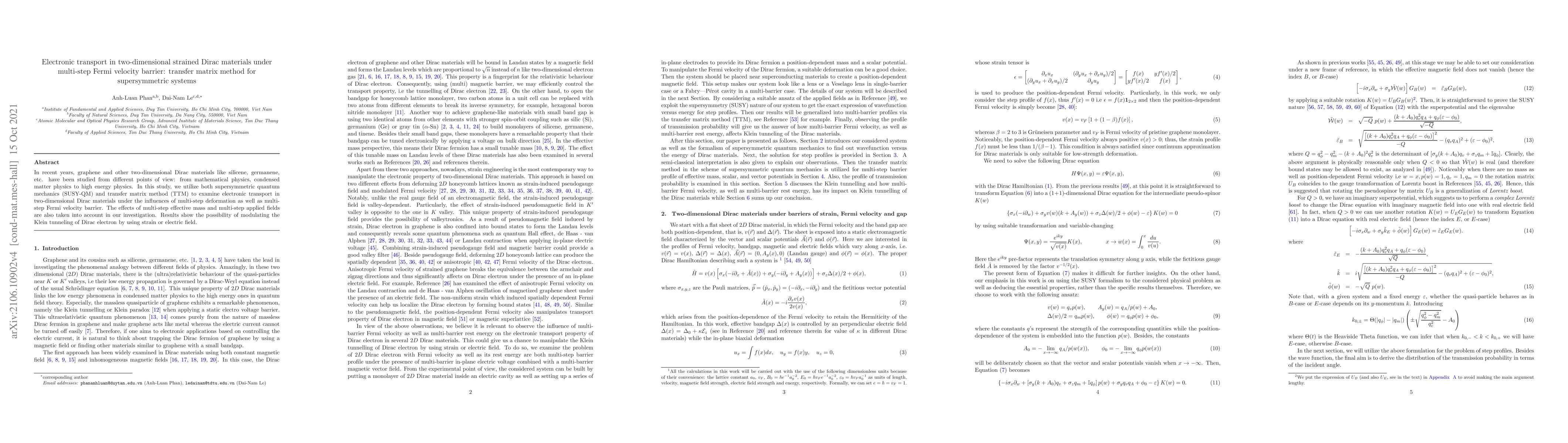 In recent years, graphene and other two-dimensional Dirac materials like silicene, germanene, etc. have been studied from different points of view: from mathematical physics, condensed matter physics to high energy physics. In this study, we utilize both supersymmetric quantum mechanics (SUSY-QM) and transfer matrix method (TTM) to examine electronic transport in two-dimensional Dirac materials under the influences of multi-step deformation as well as multi-step Fermi velocity barrier. The effects of multi-step effective mass and multi-step applied fields are also taken into account in our investigation. Results show the possibility of modulating the Klein tunneling of Dirac electron by using strain or electric field.