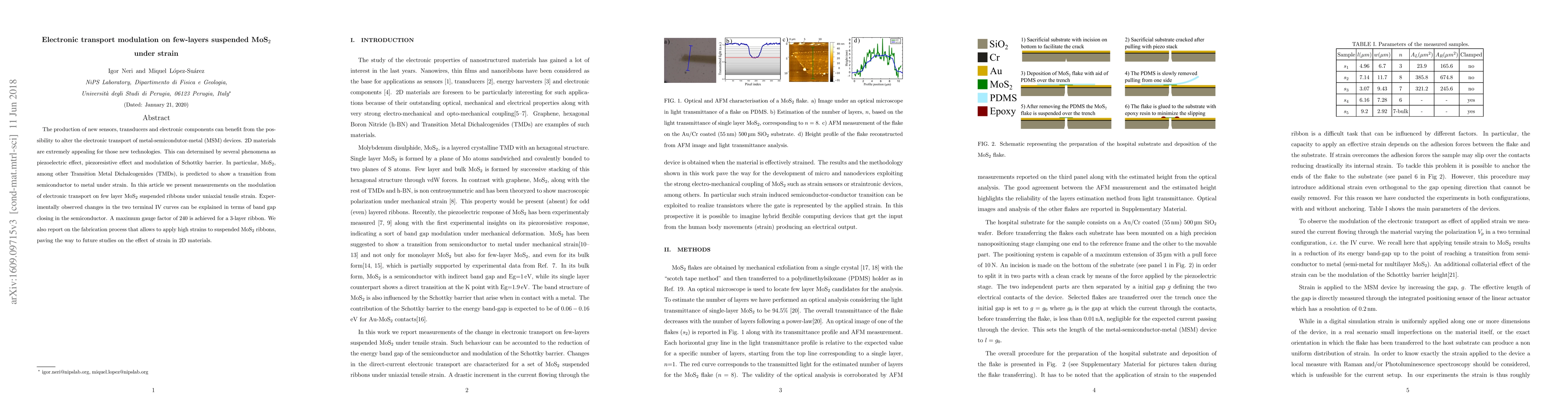 The production of new sensors, transducers and electronic components can benefit from the possibility to alter the electronic transport of metal-semicondutor-metal (MSM) devices. 2D materials are extremely appealing for those new technologies. This can determined by several phenomena as piezoelectric effect, piezoresistive effect and modulation of Schottky barrier. In particular, MoS$_2$, among other Transition Metal Dichalcogenides (TMDs), is predicted to show a transition from semiconductor to metal under strain. In this article we present measurements on the modulation of electronic transport on few layer MoS$_2$ suspended ribbons under uniaxial tensile strain. Experimentally observed changes in the two terminal IV curves can be explained in terms of band gap closing in the semiconductor. A maximum gauge factor of 240 is achieved for a 3-layer ribbon. We also report on the fabrication process that allows to apply high strains to suspended MoS$_2$ ribbons, paving the way to future studies on the effect of strain in 2D materials.