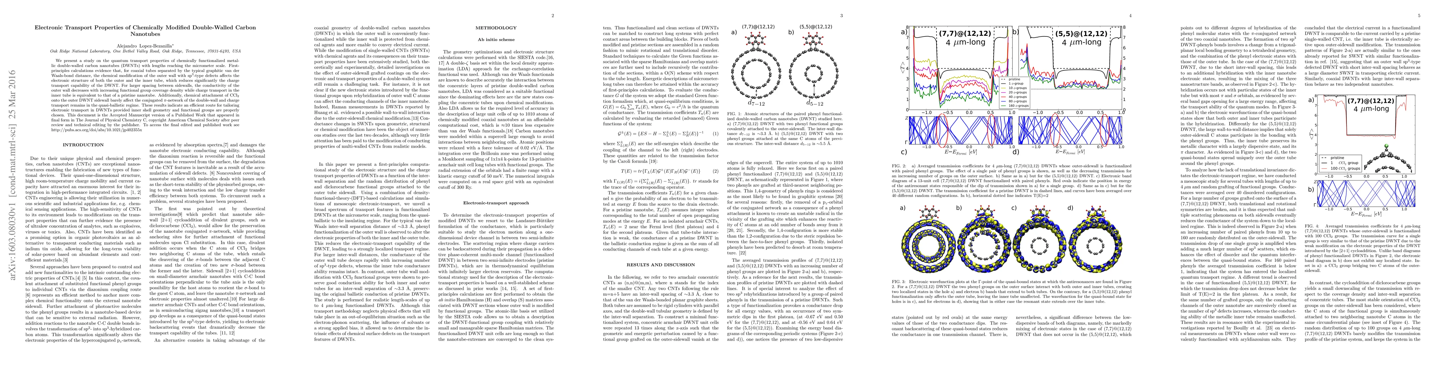This study investigates how chemical modifications on the outer wall of metallic double-walled carbon nanotubes (DWNTs) affect their electronic transport properties, revealing that functionalization can significantly reduce charge transport capability while maintaining quasi-ballistic transport in the inner tube. Proper selection of inner geometry and functional groups allows for efficient control over DWNT electronic transport.