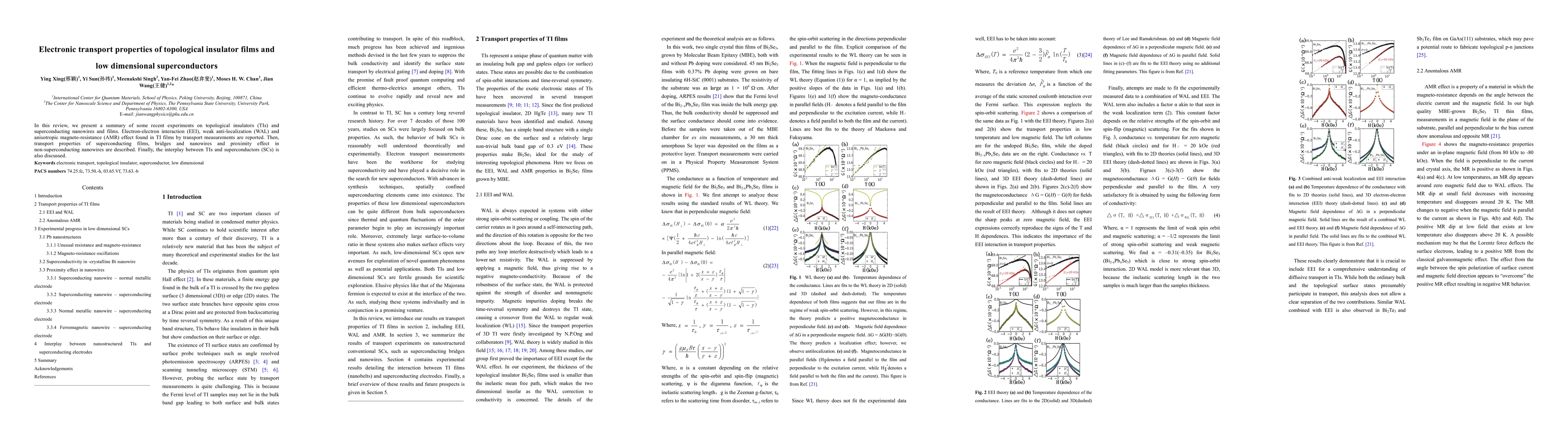 This review summarizes recent experiments on topological insulator films and low-dimensional superconductors, focusing on electron-electron interaction, weak anti-localization, and anisotropic magneto-resistance in TIs, alongside the transport properties and proximity effects in superconducting films and nanowires. The interplay between topological insulators and superconductors is also explored.