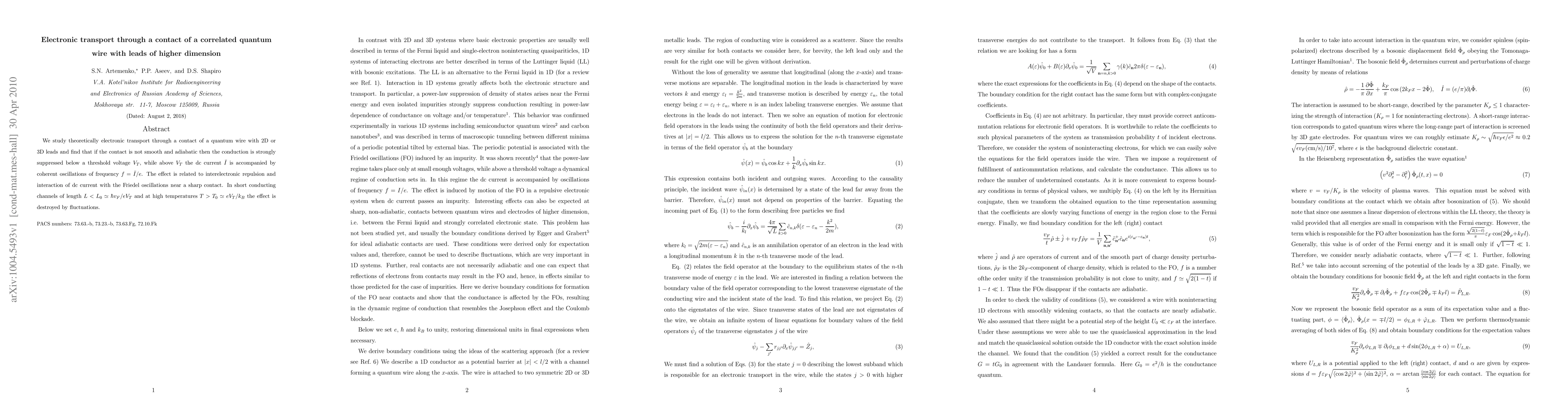 We study theoretically electronic transport through a contact of a quantum wire with 2D or 3D leads and find that if the contact is not smooth and adiabatic then the conduction is strongly suppressed below a threshold voltage $V_T$, while above $V_T$ the dc current $\bar I$ is accompanied by coherent oscillations of frequency $f=\bar I / e$. The effect is related to interelectronic repulsion and interaction of dc current with the Friedel oscillations near a sharp contact. In short conducting channels of length $L < L_0 \simeq \hbar v_F/eV_T$ and at high temperatures $T > T_0 \simeq eV_T/k_B$ the effect is destroyed by fluctuations.