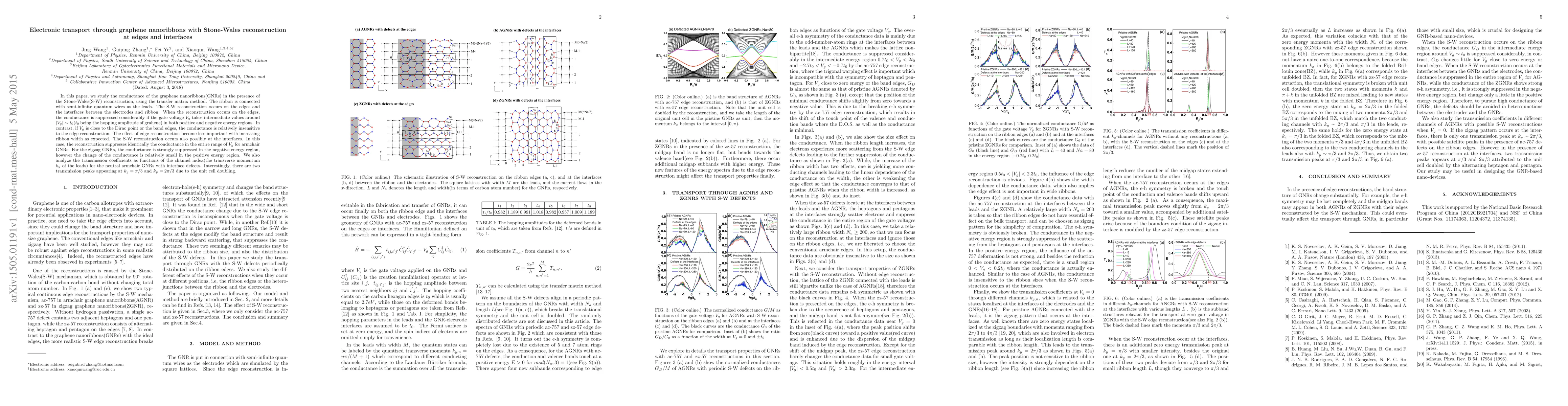 This paper investigates the electronic transport through graphene nanoribbons (GNRs) with Stone-Wales reconstruction at the edges and interfaces, finding that edge reconstruction significantly suppresses conductance at intermediate gate voltages, while interface reconstruction universally reduces conductance. The study also reveals distinct transmission peaks in armchair GNRs due to unit cell doubling.