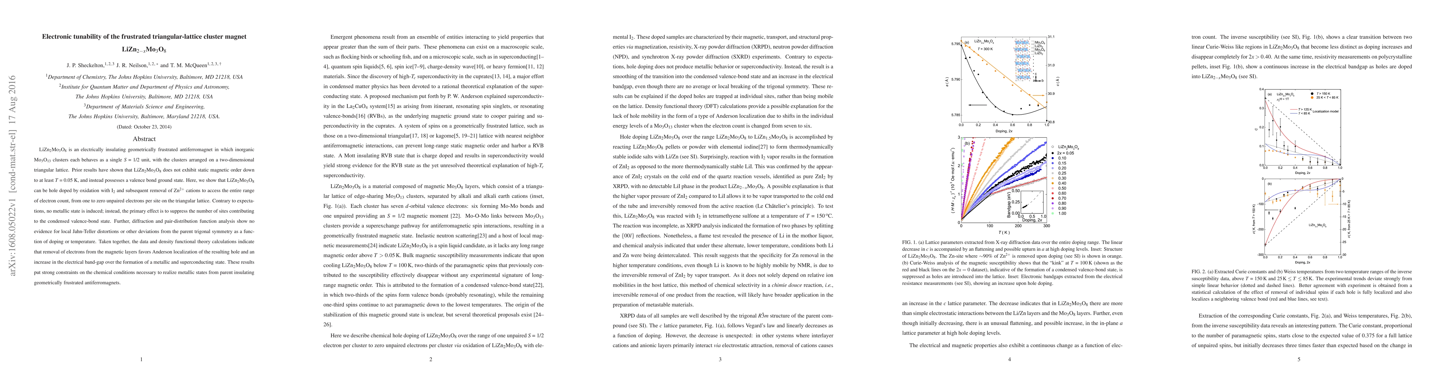LiZn$_2$Mo$_3$O$_8$ is an electrically insulating geometrically frustrated antiferromagnet in which inorganic Mo$_3$O$_{13}$ clusters each behaves as a single $S = 1/2$ unit, with the clusters arranged on a two-dimensional triangular lattice. Prior results have shown that LiZn$_2$Mo$_3$O$_8$ does not exhibit static magnetic order down to at least $T = 0.05\,K$, and instead possesses a valence bond ground state. Here, we show that LiZn$_2$Mo$_3$O$_8$ can be hole doped by oxidation with $\mathrm{I}_2$ and subsequent removal of $\mathrm{Zn}^{2+}$ cations to access the entire range of electron count, from one to zero unpaired electrons per site on the triangular lattice. Contrary to expectations, no metallic state is induced; instead, the primary effect is to suppress the number of sites contributing to the condensed valence-bond state. Further, diffraction and pair-distribution function analysis show no evidence for local Jahn-Teller distortions or other deviations from the parent trigonal symmetry as a function of doping or temperature. Taken together, the data and density functional theory calculations indicate that removal of electrons from the magnetic layers favors Anderson localization of the resulting hole and an increase in the electrical band-gap over the formation of a metallic and superconducting state. These results put strong constraints on the chemical conditions necessary to realize metallic states from parent insulating geometrically frustrated antiferromagnets.