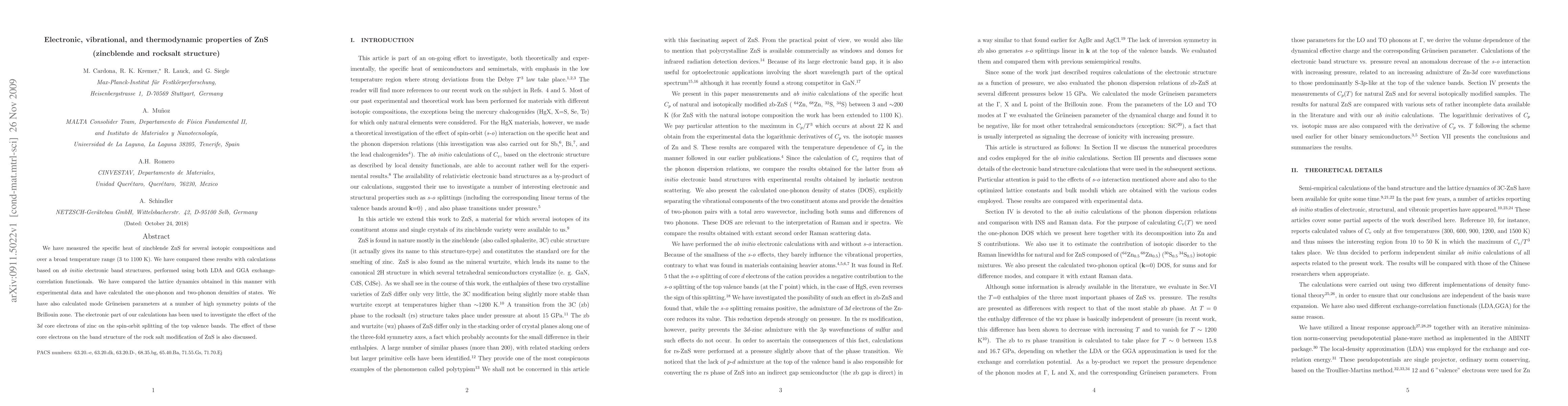 We have measured the specific heat of zincblende ZnS for several isotopic compositions and over a broad temperature range (3 to 1100 K). We have compared these results with calculations based on ab initio electronic band structures, performed using both LDA and GGA exchange- correlation functionals. We have compared the lattice dynamics obtained in this manner with experimental data and have calculated the one-phonon and two-phonon densities of states. We have also calculated mode Grueneisen parameters at a number of high symmetry points of the Brillouin zone. The electronic part of our calculations has been used to investigate the effect of the 3d core electrons of zinc on the spin-orbit splitting of the top valence bands. The effect of these core electrons on the band structure of the rock salt modification of ZnS is also discussed.