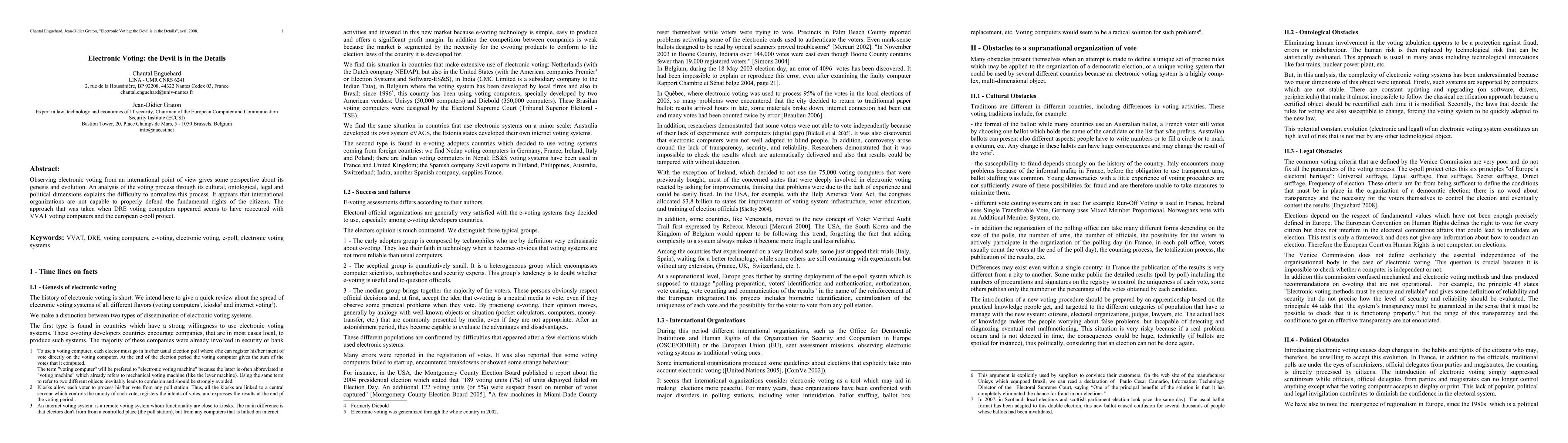 Observing electronic voting from an international point of view gives some perspective about its genesis and evolution. An analysis of the voting process through its cultural, ontological, legal and political dimensions explains the difficulty to normalize this process. It appears that international organizations are not capable to properly defend the fundamental rights of the citizens. The approach that was taken when DRE voting computers appeared seems to have reoccured with VVAT voting computers and the european e-poll project.