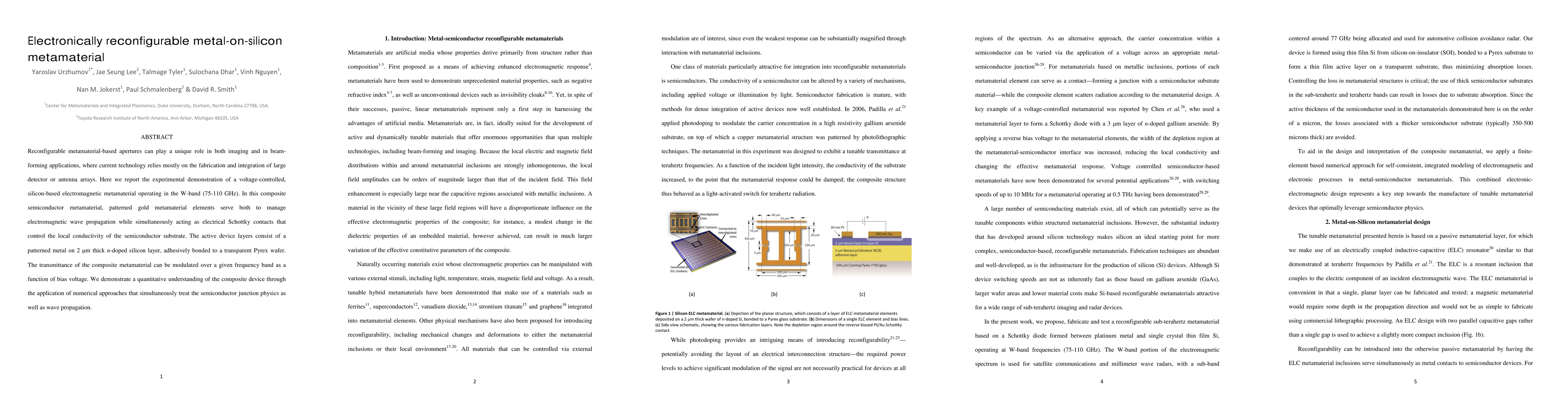 This paper presents an electronically reconfigurable metal-on-silicon metamaterial operating in the W-band, where patterned gold elements manage electromagnetic waves and act as electrical contacts to modulate the silicon substrate's conductivity. The device's transmittance can be tuned via bias voltage, validated through numerical simulations.