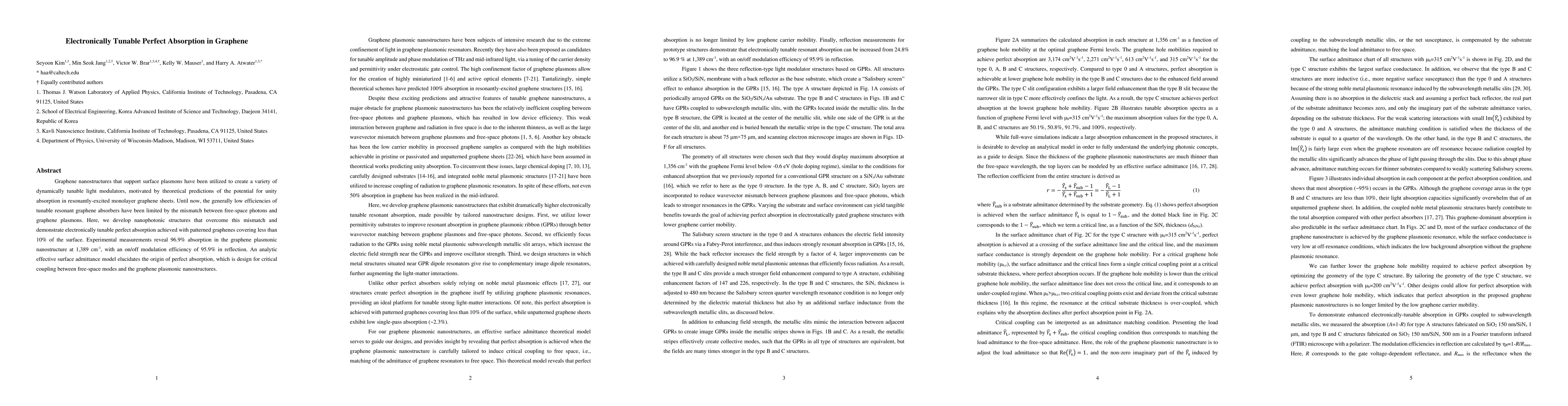 Summary: Researchers develop nanophotonic structures that enable electronically tunable perfect absorption in graphene, achieving 96.9% absorption efficiency with a modulation efficiency of 95.9%, overcoming previous limitations by optimizing the coupling between free-space photons and graphene plasmons.