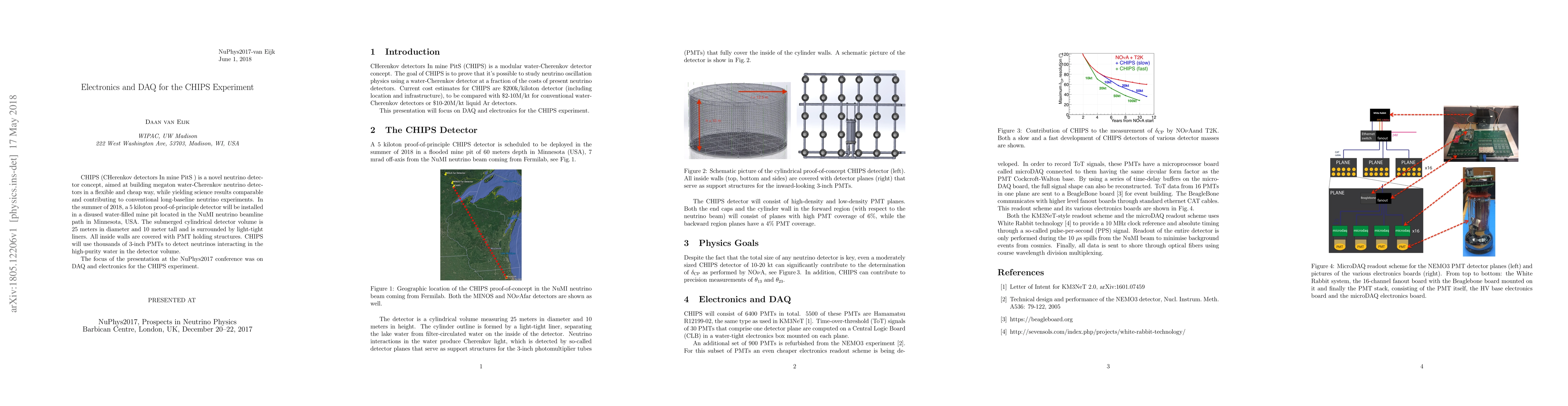The CHIPS experiment aims to construct a cost-effective megaton water-Cherenkov neutrino detector using thousands of 3-inch PMTs in a disused mine pit. The presentation at NuPhys2017 focused on the data acquisition (DAQ) systems and electronics necessary to support this innovative neutrino detection project.