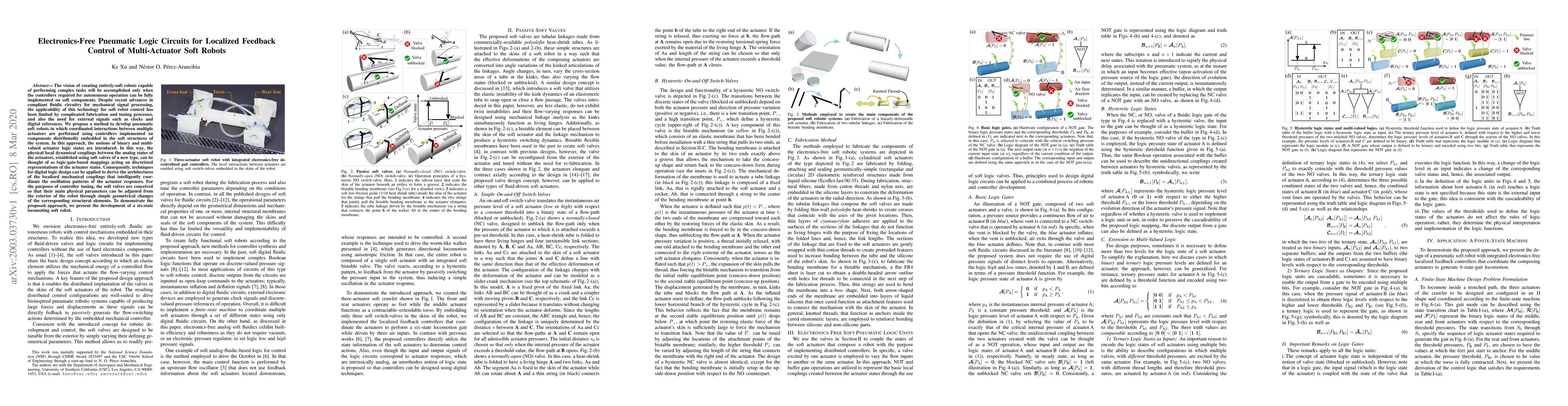 The vision of creating entirely-soft robots capable of performing complex tasks will be accomplished only when the controllers required for autonomous operation can be fully implemented on soft components. Despite recent advances in compliant fluidic circuitry for mechanical signal processing, the applicability of this technology for soft robot control has been limited by complicated fabrication and tuning processes, and also the need for external signals such as clocks and digital references. We propose a method to develop pneumatic soft robots in which coordinated interactions between multiple actuators are performed using controllers implemented on components distributedly embedded in the soft structures of the system. In this approach, the notions of binary and multi-valued actuator logic states are introduced. In this way, the physical local dynamical couplings between the analog states of the actuators, established using soft valves of a new type, can be thought of as logic-gate-based mappings acting on discretized representations of the actuator states. Consequently, techniques for digital logic design can be applied to derive the architectures of the localized mechanical couplings that intelligently coordinate the oscillation patterns of the actuator responses. For the purposes of controller tuning, the soft valves are conceived so that their main physical parameters can be adjusted from the exterior of the robot through simple geometrical changes of the corresponding structural elements. To demonstrate the proposed approach, we present the development of a six-state locomoting soft robot.
