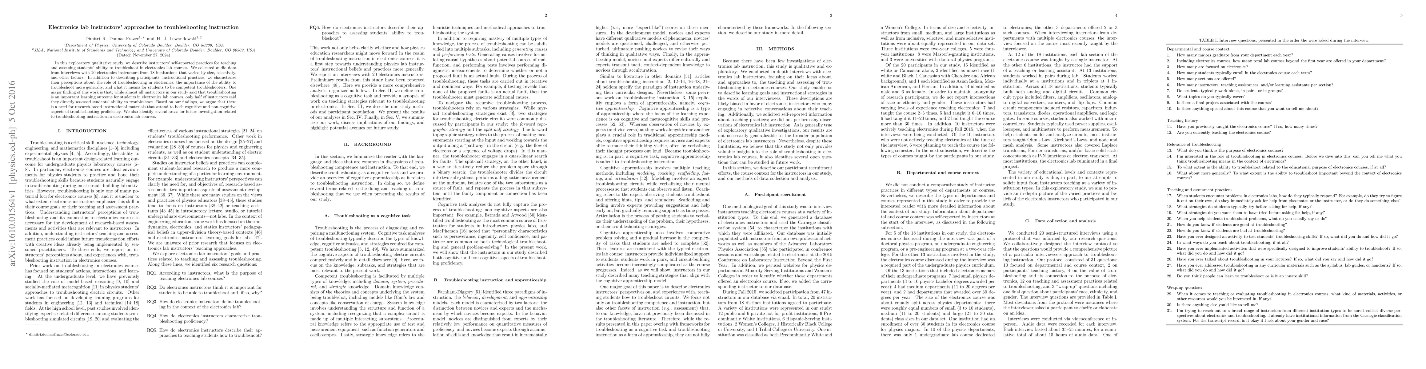 This study explores electronics lab instructors' self-reported practices for teaching troubleshooting, revealing that while most instructors view it as crucial, only half directly assess students' skills. The research highlights a need for research-based instructional materials to enhance troubleshooting proficiency.