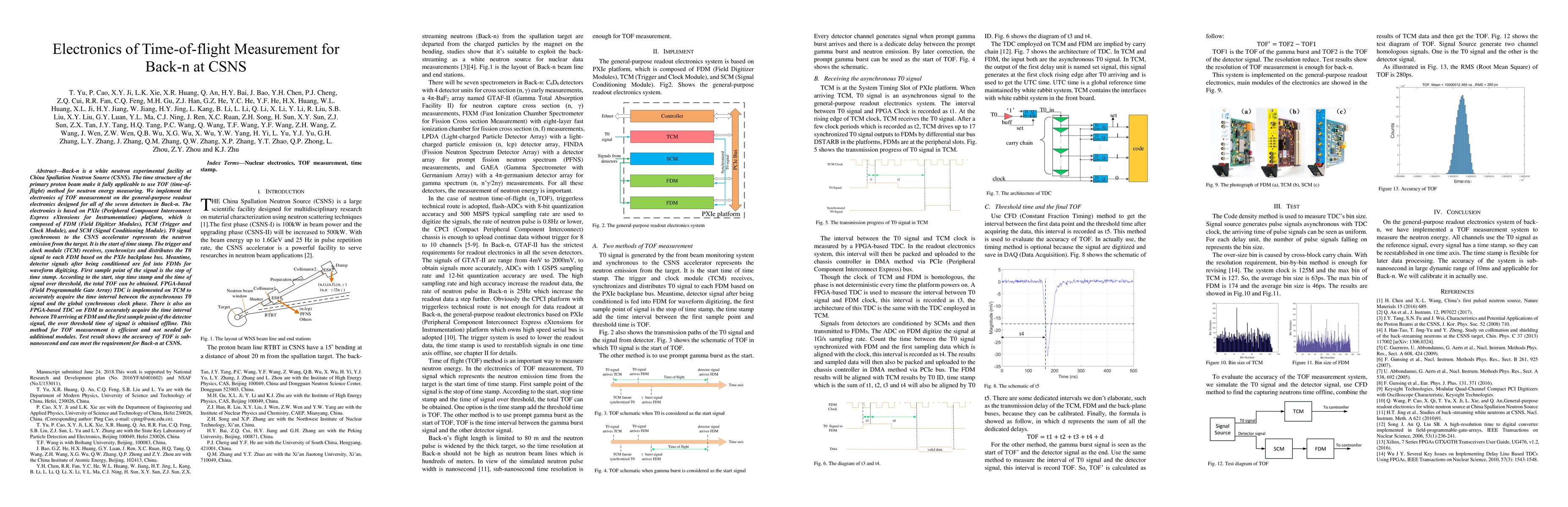 This paper details the implementation of time-of-flight (TOF) measurement electronics for the Back-n facility at CSNS, utilizing a PXIe platform with FDM, TCM, and SCM modules. The system accurately measures neutron energy by capturing the time interval between the T0 signal and detector signals, achieving sub-nanosecond accuracy.
