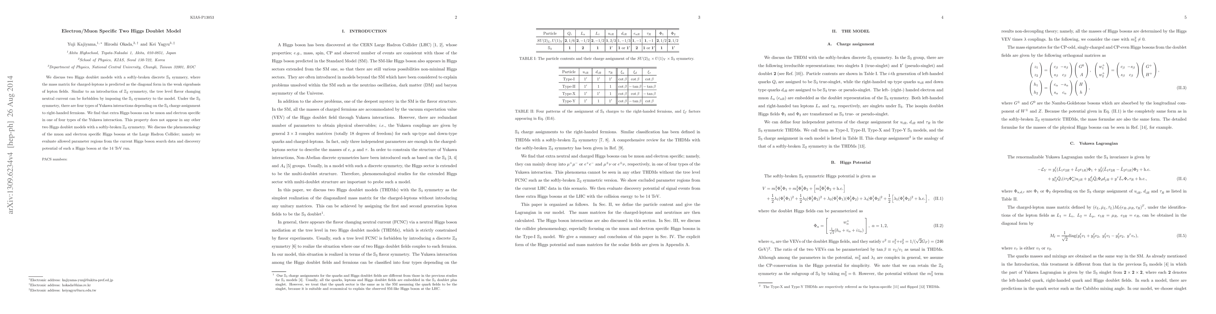 We discuss two Higgs doublet models with a softly-broken discrete $\mathbb{S}_3$ symmery, where the mass matrix for charged-leptons is predicted as the diagonal form in the weak eigenbasis of lepton fields. Similar to an introduction of $\mathbb{Z}_2$ symmetry, the tree level flavor changing neutral current can be forbidden by imposing the $\mathbb{S}_3$ symmetry to the model. Under the $\mathbb{S}_3$ symmetry, there are four types of Yukawa interactions depending on the $\mathbb{S}_3$ charge assignment to right-handed fermions. We find that extra Higgs bosons can be muon and electron specific in one of four types of the Yukawa interaction. This property does not appear in any other two Higgs doublet models with a softly-broken ${\mathbb Z}_2$ symmetry. We discuss the phenomenology of the muon and electron specific Higgs bosons at the Large Hadron Collider; namely we evaluate allowed parameter regions from the current Higgs boson search data and discovery potential of such a Higgs boson at the 14 TeV run.