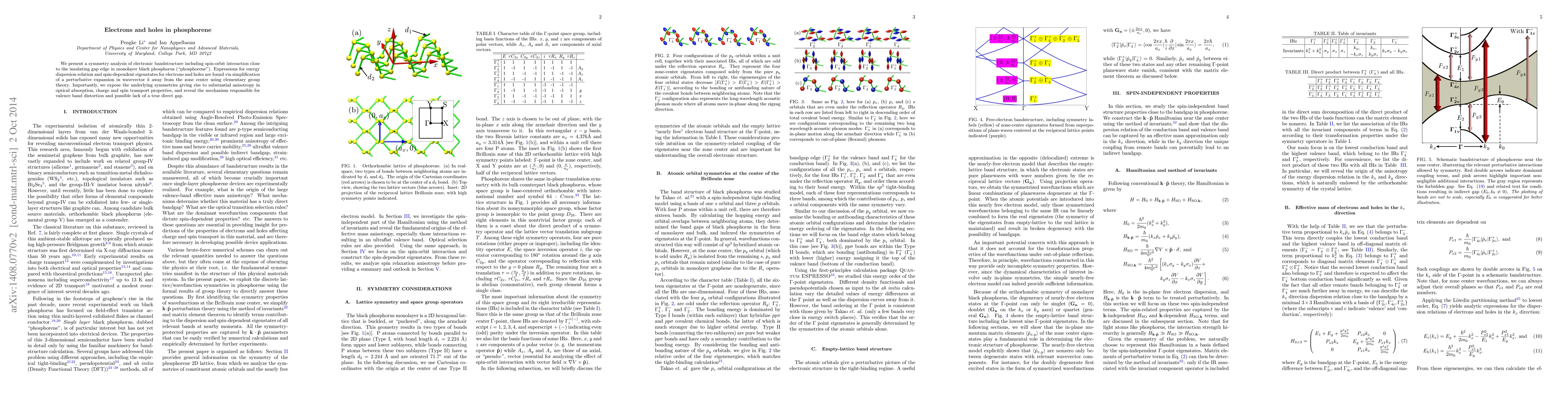 We present a symmetry analysis of electronic bandstructure including spin-orbit interaction close to the insulating gap edge in monolayer black phosphorus ('phosphorene'). Expressions for energy dispersion relation and spin-dependent eigenstates for electrons and holes are found via simplification of a perturbative expansion in wavevector $k$ away from the zone center using elementary group theory. Importantly, we expose the underlying symmetries giving rise to substantial anisotropy in optical absorption, charge and spin transport properties, and reveal the mechanism responsible for valence band distortion and possible lack of a true direct gap.