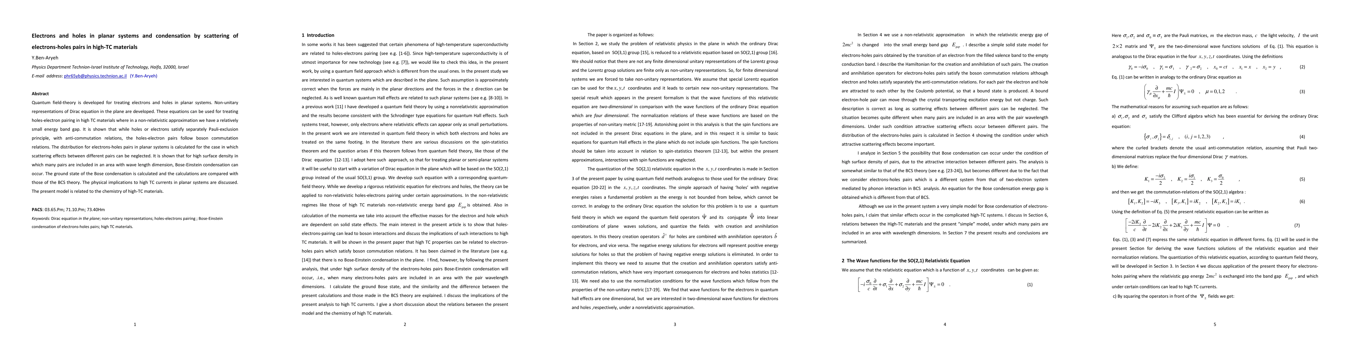 Quantum field-theory is developed for treating electrons and holes in planar systems. Non-unitary representations of Dirac equation in the plane are developed. These equations can be used for treating holes-electron pairing in high TC materials where in a non-relativistic approximation we have a relatively small energy band gap. It is shown that while holes or electrons satisfy separately Pauli-exclusion principle, with anti-commutation relations, the holes-electron pairs follow boson commutation relations. The distribution for electrons-holes pairs in planar systems is calculated for the case in which scattering effects between different pairs can be neglected. It is shown that for high surface density in which many pairs are included in an area with wave length dimension, Bose-Einstein condensation can occur. The ground state of the Bose condensation is calculated and the calculations are compared with those of the BCS theory. The physical implications to high TC currents in planar systems are discussed. The present model is related to the chemistry of high-TC materials. PACS: 03.65.