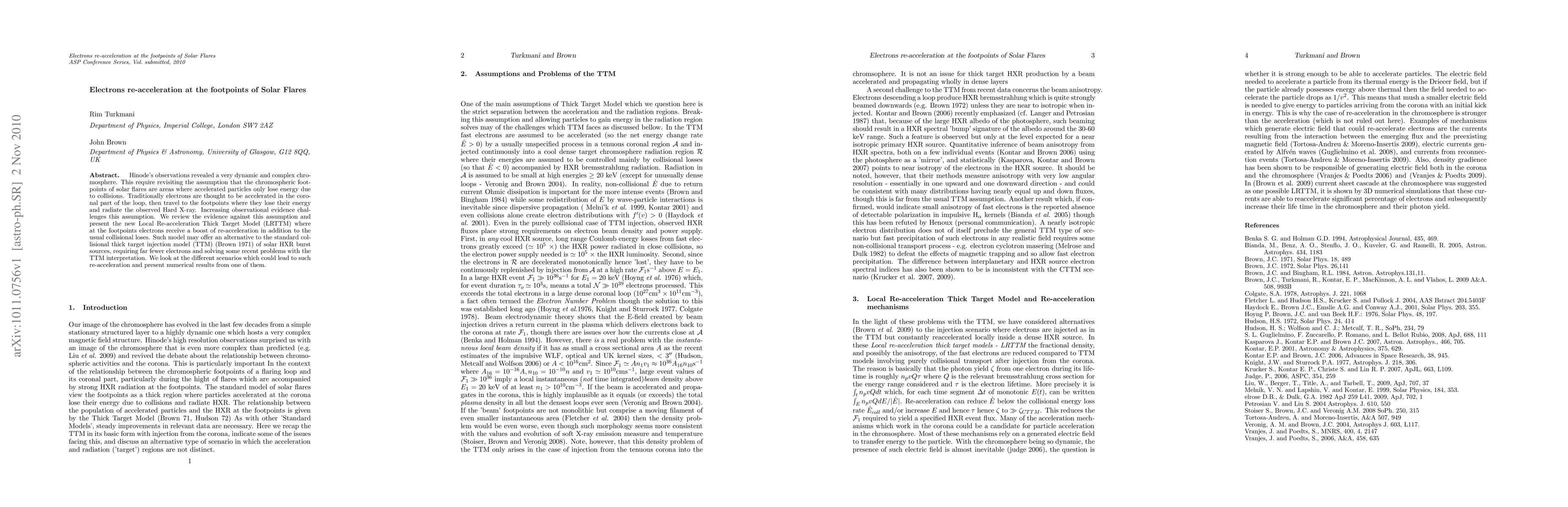 Hinode's observations revealed a very dynamic and complex chromosphere. This require revisiting the assumption that the chromospheric footpoints of solar flares are areas where accelerated particles only lose energy due to collisions. Traditionally electrons are thought to be accelerated in the coronal part of the loop, then travel to the footpoints where they lose their energy and radiate the observed Hard X-ray. Increasing observational evidence challenges this assumption. We review the evidence against this assumption and present the new Local Re-acceleration Thick Target Model (LRTTM) where at the footpoints electrons receive a boost of re-acceleration in addition to the usual collisional loses. Such model may offer an alternative to the 'standard' collisional thick target injection model (TTM) (Brown 1971) of solar HXR burst sources, requiring far fewer electrons and solving some recent problems with the TTM interpretation. We look at the different scenarios which could lead to such re-acceleration and present numerical results from one of them.