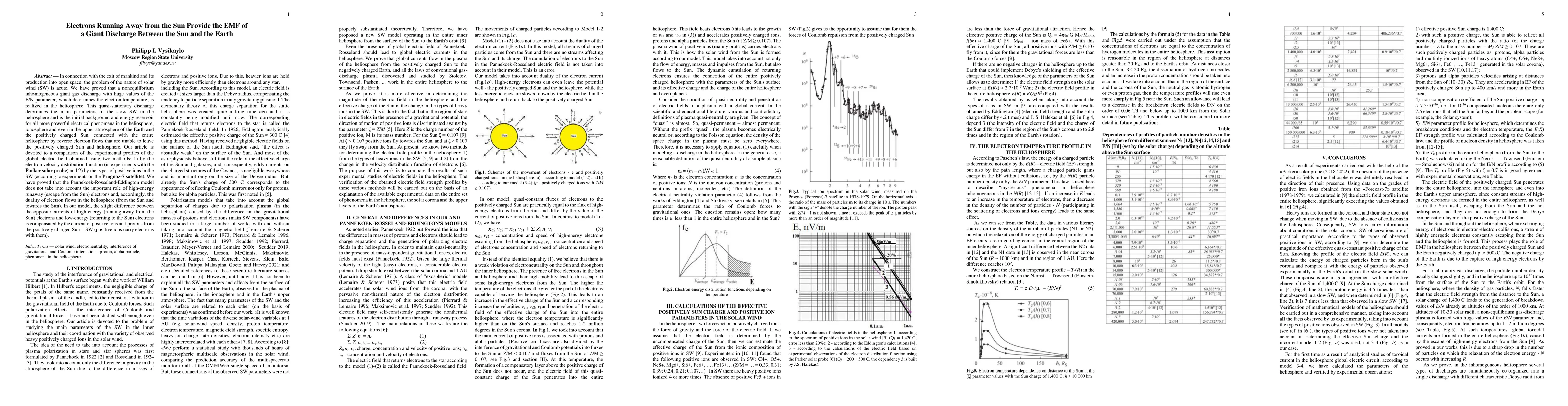 In connection with the exit of mankind and its production into open space, the problem of the nature of solar wind (SW) is acute. We have proved that a nonequilibrium inhomogeneous giant gas discharge with huge values of the E/N parameter, which determines the electron temperature, is realized in the heliosphere. This quasi-stationary discharge determines the main parameters of the slow SW in the heliosphere and is the initial background and energy reservoir for all more powerful electrical phenomena in the heliosphere, ionosphere and even in the upper atmosphere of the Earth and the positively charged Sun, connected with the entire heliosphere by reverse electron flows that are unable to leave the positively charged Sun and heliosphere. Our article is devoted to a comparison of the experimental profiles of the global electric field obtained using two methods: 1) by the electron velocity distribution function (in experiments with the Parker solar probe) and 2) by the types of positive ions in the SW (according to experiments on the Prognozz - 7 satellite). We have proved that the Pannekoek-Rosseland-Eddington model does not take into account the important role of high-energy runaway (escape from the Sun) electrons and, accordingly, the duality of electron flows in the heliosphere (from the Sun and towards the Sun). In our model, the slight difference between the opposite currents of high-energy (running away from the Sun) electrons and low-energy (returning to the Sun) electrons is compensated by the current of positive ions and protons from the positively charged Sun - SW (positive ions carry electrons with them).