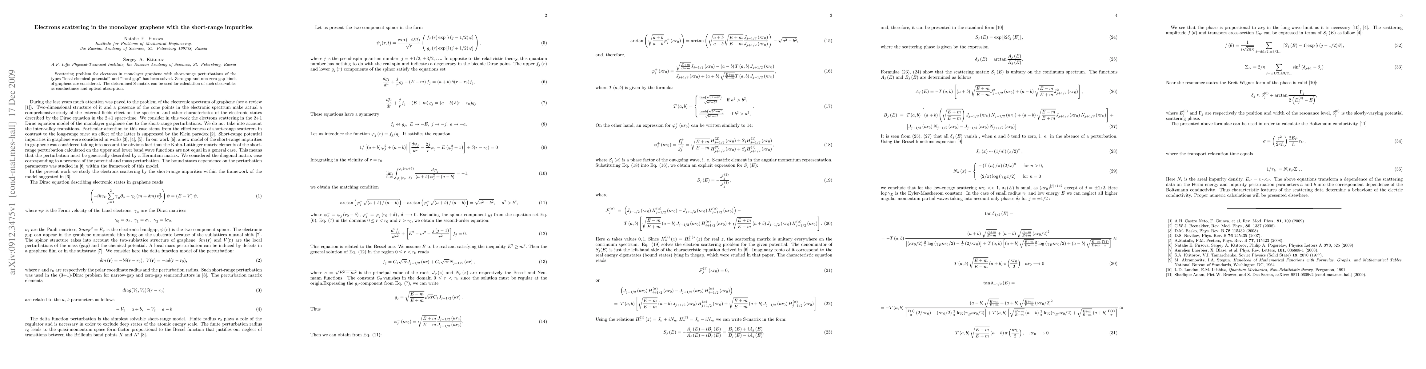 This paper solves the scattering problem for electrons in monolayer graphene with short-range impurities, determining the S-matrix for both zero-gap and non-zero gap graphene, which can be used to calculate conductance and optical absorption.
