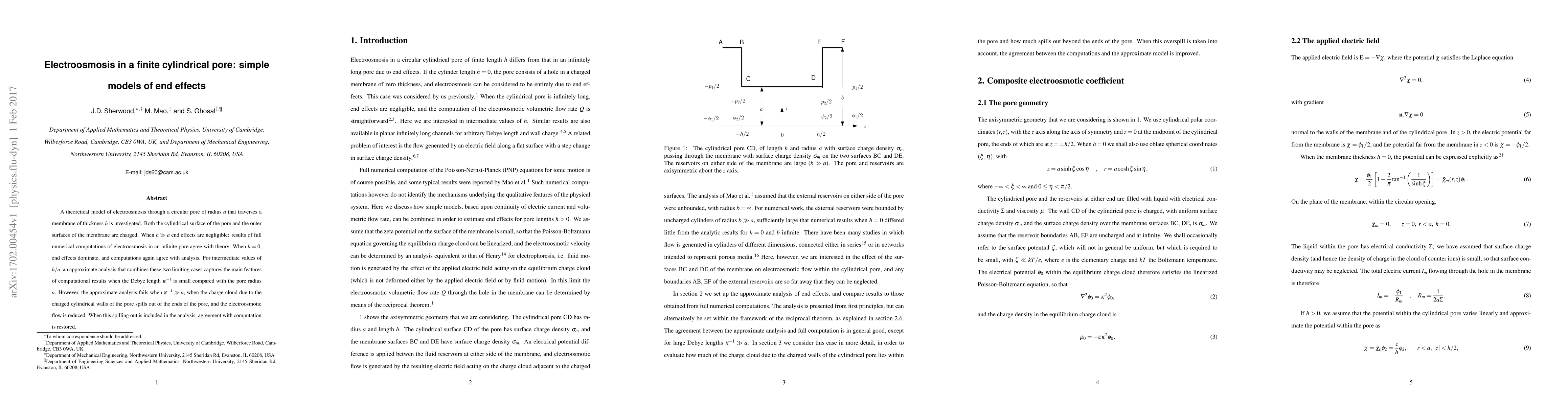 This paper investigates electroosmosis in a finite cylindrical pore through a charged membrane, showing that end effects significantly influence flow when the membrane thickness is comparable to the pore radius. An approximate analysis captures main features under small Debye length conditions, but fails when the Debye length is large, until accounting for charge cloud spilling out from the pore ends.