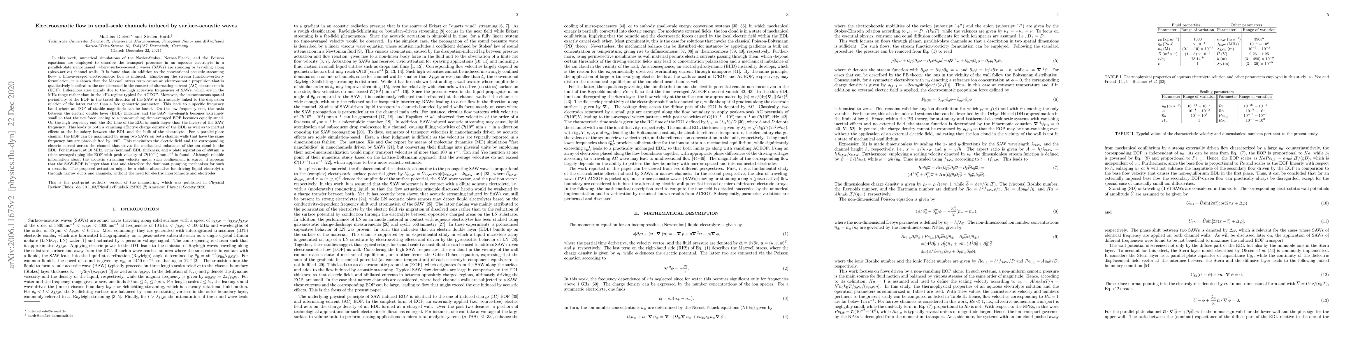 This paper investigates the electroosmotic flow induced by surface-acoustic waves in small-scale channels, revealing a time-averaged electroosmotic flow alongside conventional acoustic streaming. The study finds that the Maxwell stress term drives this flow, similar to AC electroosmosis, but at much higher MHz frequencies.