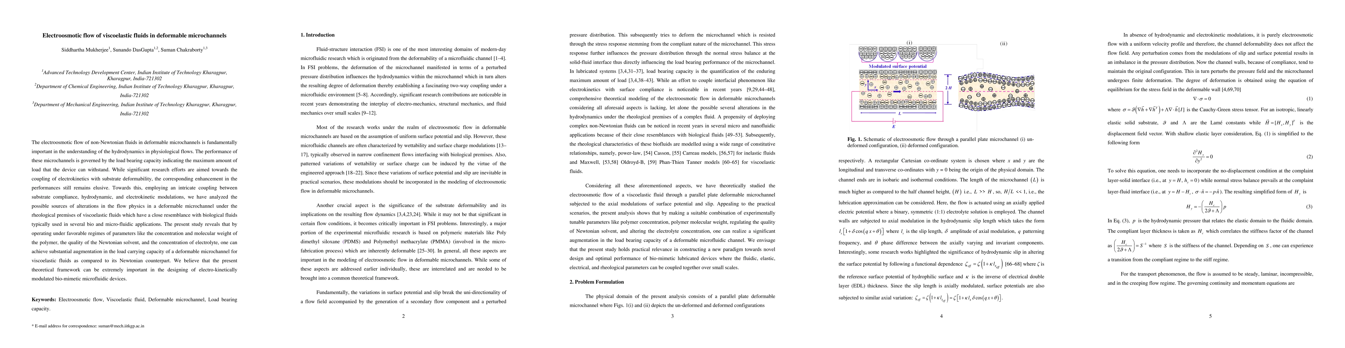 This paper investigates the electroosmotic flow of viscoelastic fluids in deformable microchannels, revealing that optimal conditions for polymer concentration, molecular weight, solvent quality, and electrolyte concentration can significantly enhance the load-bearing capacity of these microchannels compared to Newtonian fluids. The findings provide a theoretical basis for designing advanced electrokinetically modulated bio-mimetic microfluidic devices.