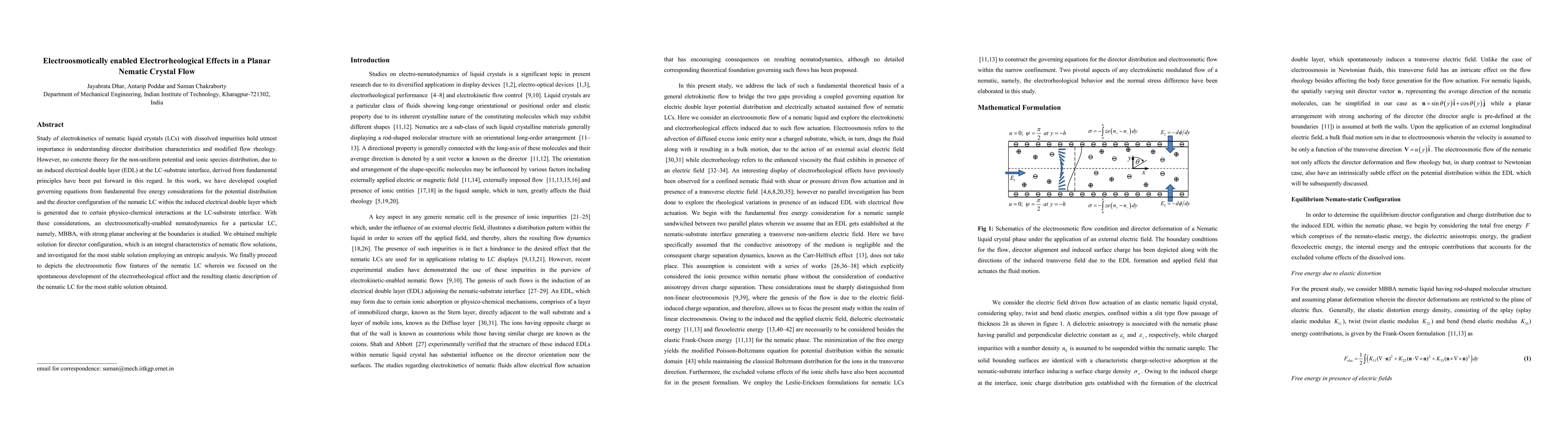 Study of electrokinetics of nematic liquid crystals (LCs) with dissolved impurities hold utmost importance in understanding director distribution characteristics and modified flow rheology. However, no concrete theory for the non-uniform potential and ionic species distribution, due to an induced electrical double layer (EDL) at the LC-substrate interface, derived from fundamental principles have been put forward in this regard. In this work, we have developed coupled governing equations from fundamental free energy considerations for the potential distribution and the director configuration of the nematic LC within the induced electrical double layer which is generated due to certain physico-chemical interactions at the LC-substrate interface. With these considerations, an electroosmotically-enabled nematodynamics for a particular LC, namely, MBBA, with strong planar anchoring at the boundaries is studied. We obtained multiple solution for director configuration, which is an integral characteristics of nematic flow solutions, and investigated for the most stable solution employing an entropic analysis. We finally proceed to depicts the electroosmotic flow features of the nematic LC wherein we focused on the spontaneous development of the electrorheological effect and the resulting elastic description of the nematic LC for the most stable solution obtained.