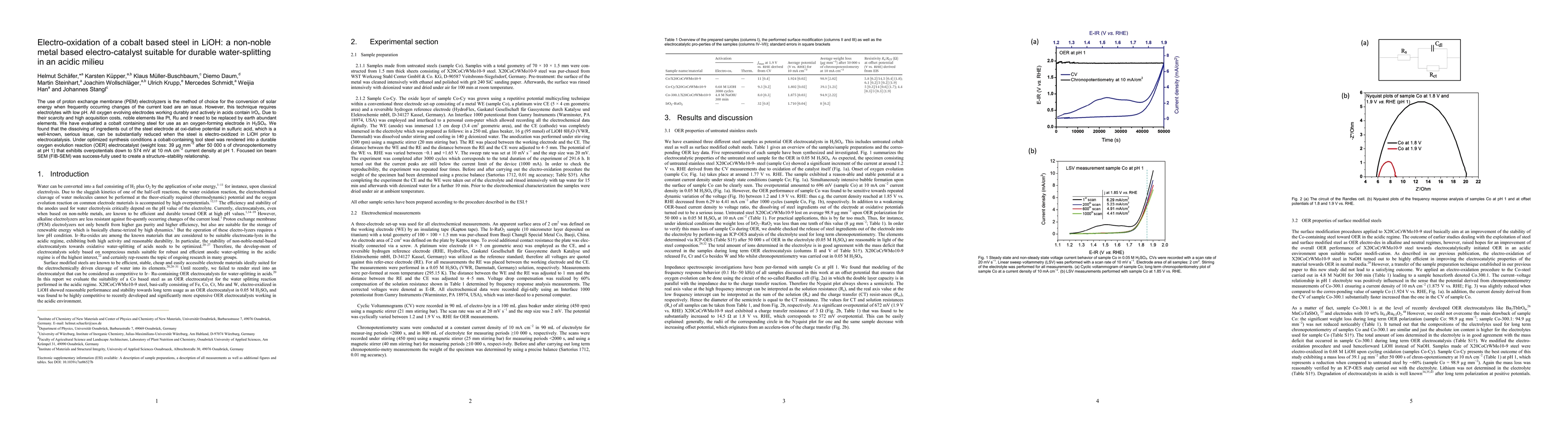 This study investigates a cobalt-based steel as a non-noble metal electro-catalyst for durable water-splitting in acidic conditions. Electro-oxidation in LiOH prior to use in H2SO4 reduces ingredient dissolution, resulting in a stable oxygen evolution reaction electrocatalyst with minimal weight loss and low overpotentials.