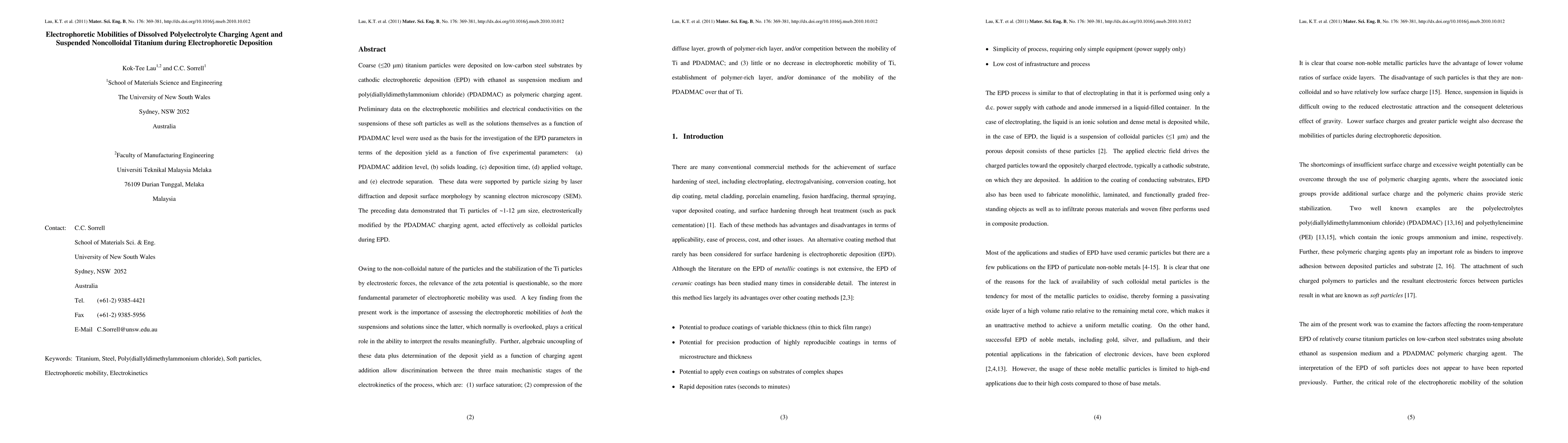 The study investigates the electrophoretic mobilities of dissolved polyelectrolyte charging agents and suspended non-colloidal titanium particles during electrophoretic deposition, highlighting the importance of assessing both suspension and solution mobility for accurate interpretation of results.