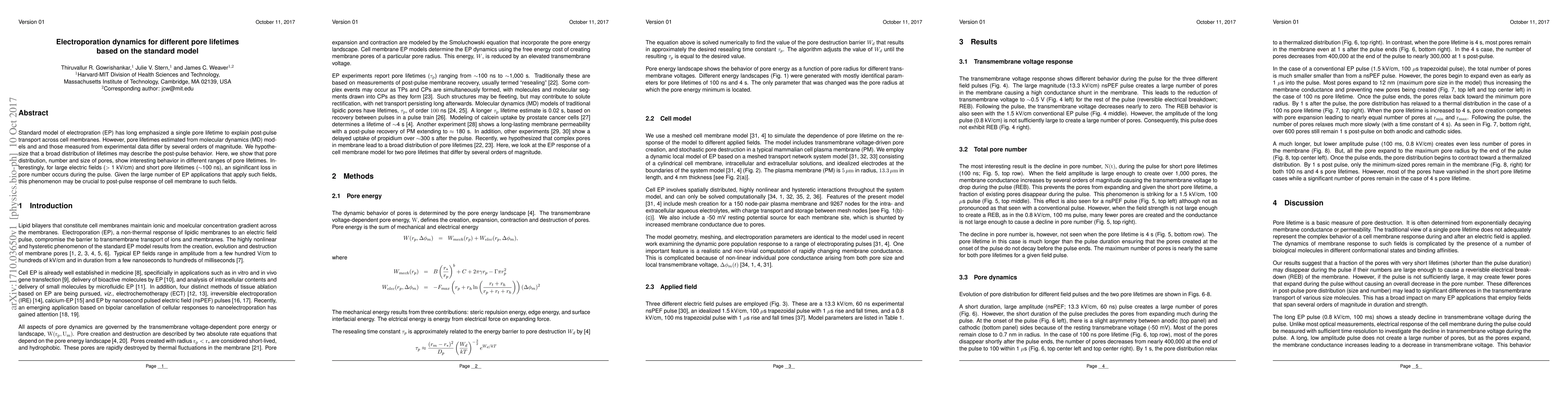 Standard model of electropration (EP) has long emphasized a single pore lifetime to explain post-pulse transport across cell membranes. However, pore lifetimes estimated from molecular dynamics (MD) models and and those measured from experimental data differ by several orders of magnitude. We hypothesize that a broad distribution of lifetimes may describe the post-pulse behavior. Here, we show that pore distribution, number and size of pores, show interesting behavior in different ranges of pore lifetimes. Interestingly, for large electric fields (greater than 1 kV/cm) and short pore lifetimes (approximately 100 ns), an significant loss in pore number occurs during the pulse. Given the large number of EP applications that apply such fields, this phenomenon may be crucial to post-pulse response of cell membrane to such fields.
