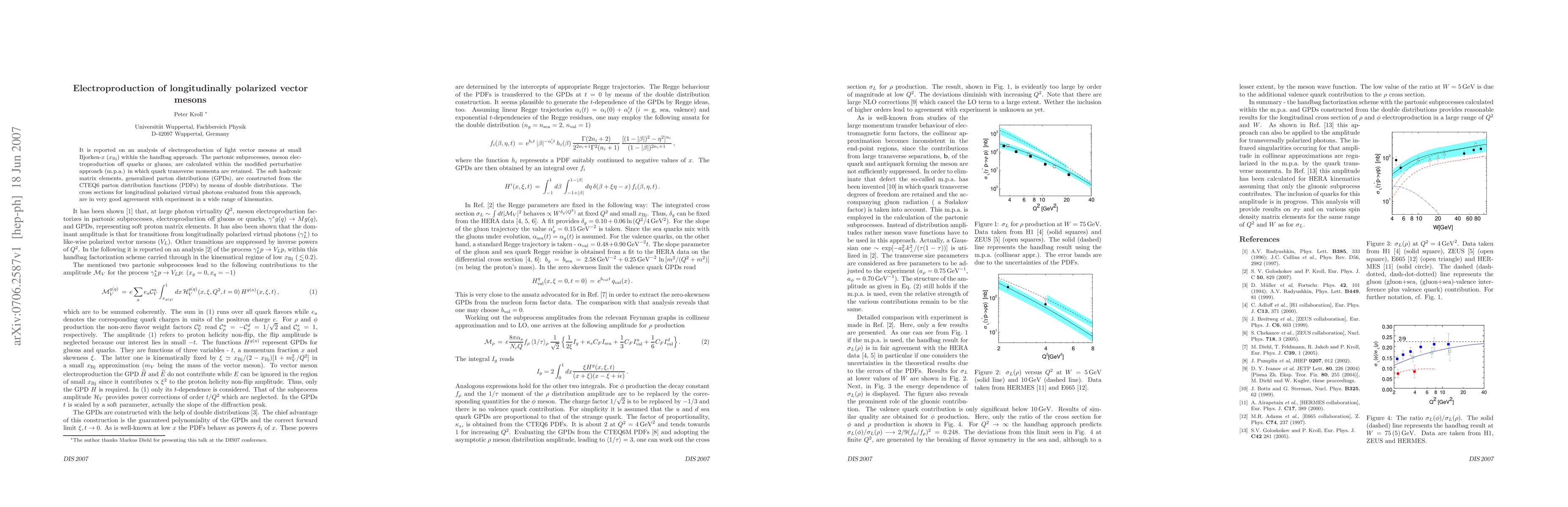 This paper analyzes the electroproduction of light vector mesons at small Bjorken-x using the handbag approach, incorporating quark transverse momenta and generalized parton distributions. The calculated cross sections for longitudinally polarized vector mesons align well with experimental data, as presented at the DIS2007 conference.