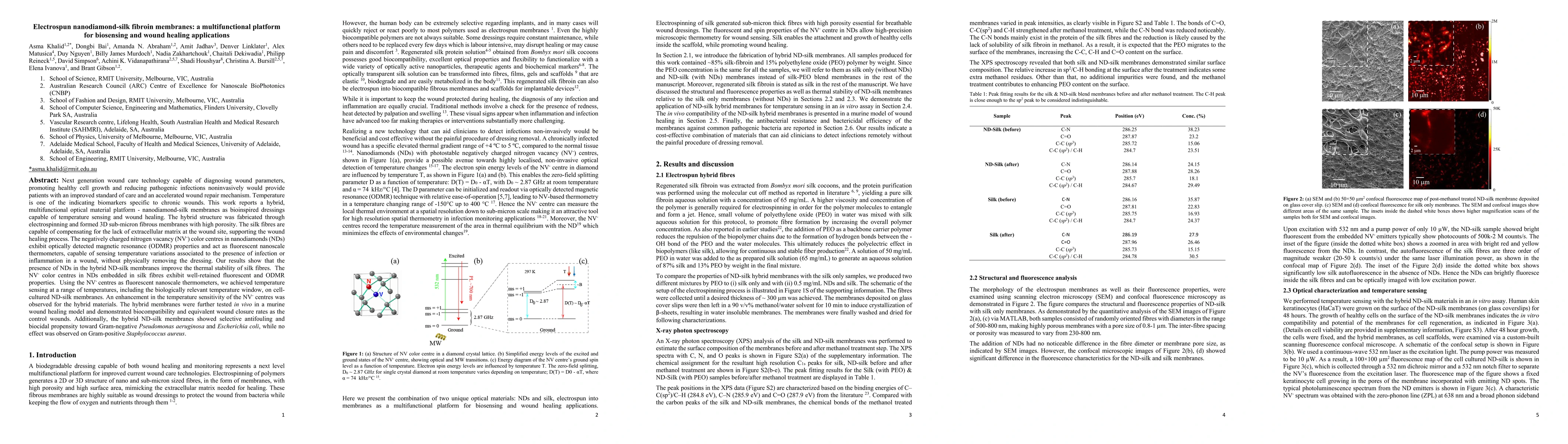 This paper presents a multifunctional electrospun nanodiamond-silk fibroin membrane for biosensing and wound healing, capable of temperature sensing and promoting wound healing. The hybrid material, with NV- color centres in nanodiamonds acting as fluorescent thermometers, shows enhanced temperature sensitivity and biocompatibility, along with antifouling properties against common bacterial pathogens.